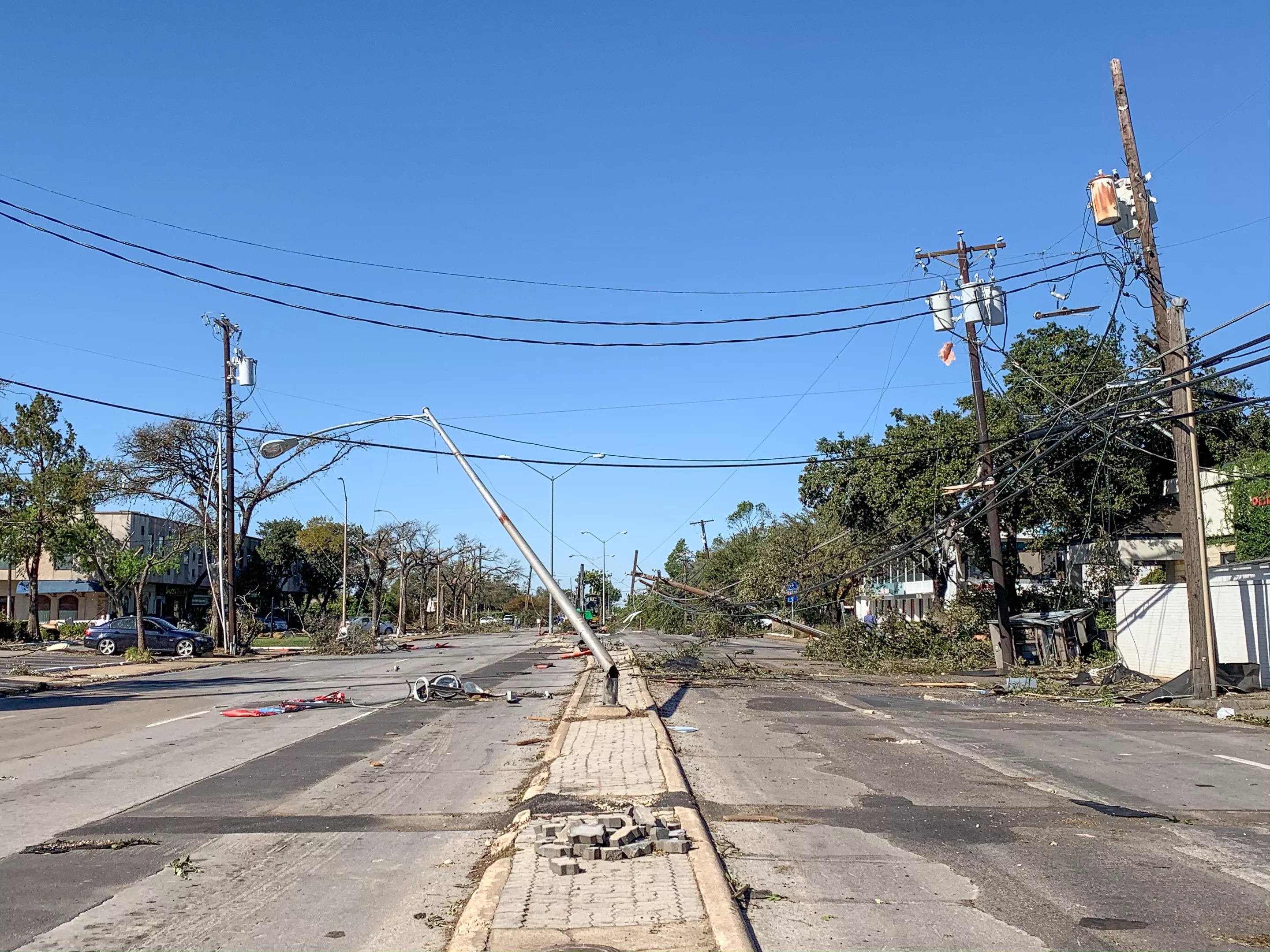 Streets are covered with broken electrical and telephone wires, retail stores lost windows and roofs, and restaurants in the area are closed without power. The southeast corner of the intersection saw major damage, while somehow the exterior of Neighborhood Services Bar and Grill appears spared, based on aesthetics.
