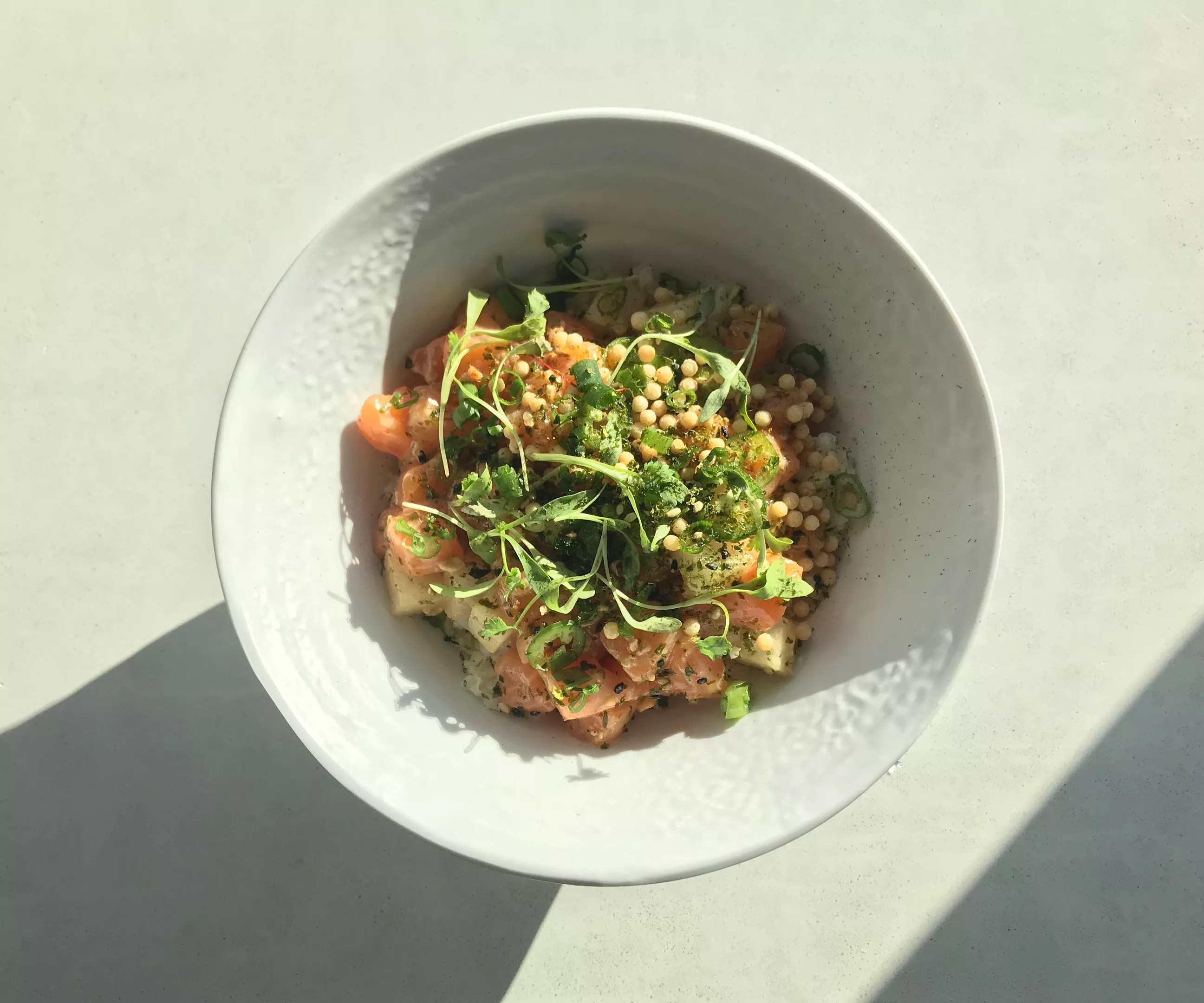 At first, it’s like ordering poke at any other restaurant kiosk. You scroll through beautiful pictures of coconut curry hamachi and wasabi ponzu salmon bowls, mulling over add-ins like avocado and micro radish. Add marinated shiitake, remove wasabi tobiko, sub cauliflower “rice” for sushi rice. That draft rosé sounds good; you’ll take a glass of that, too.