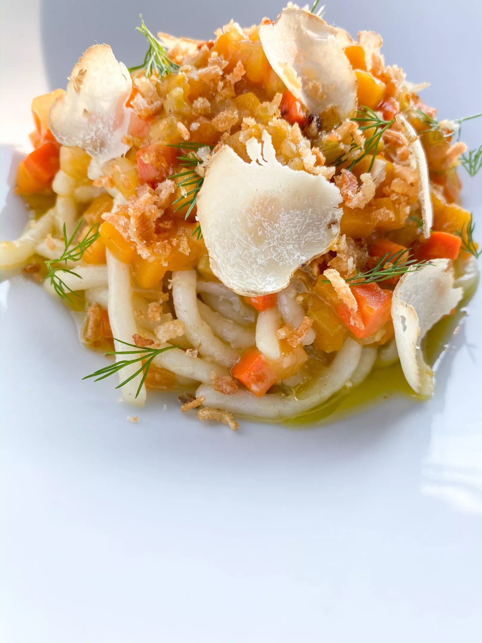 Butternut squash “Bolognese” with house-made vermicelli noodles, butternut squash, celery, onions and carrots, topped with shaved white truffle ($28)