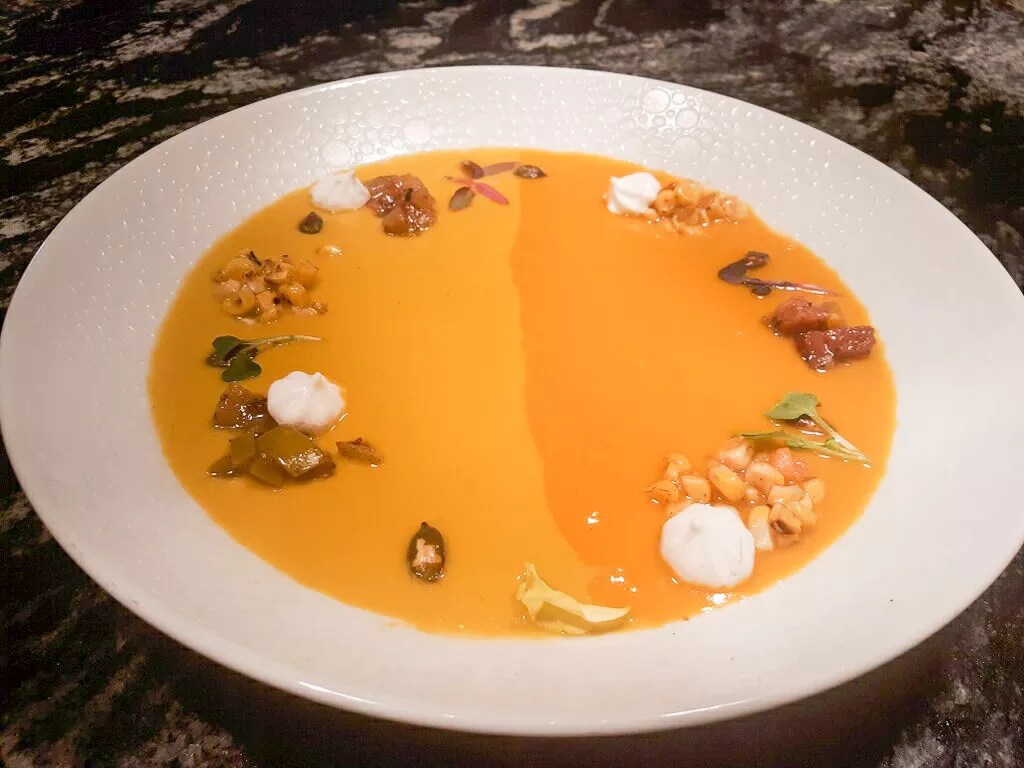 Butternut squash and roasted corn soup duo at Flora Street