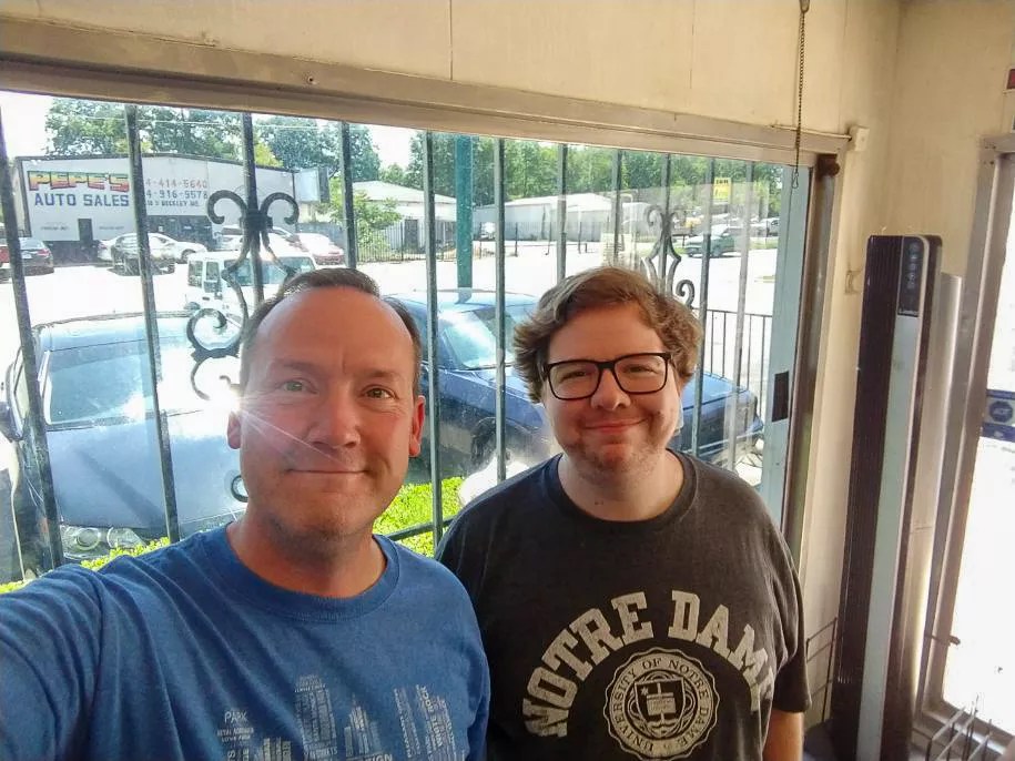 The small interior is just large enough for an awkward, two-person selfie. (Pictured here are Philip Kingston and TC Fleming.)