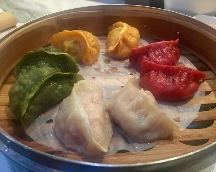 The Dumpling Sampler at Royal China, with pork, shrimp, chicken and vegetable.