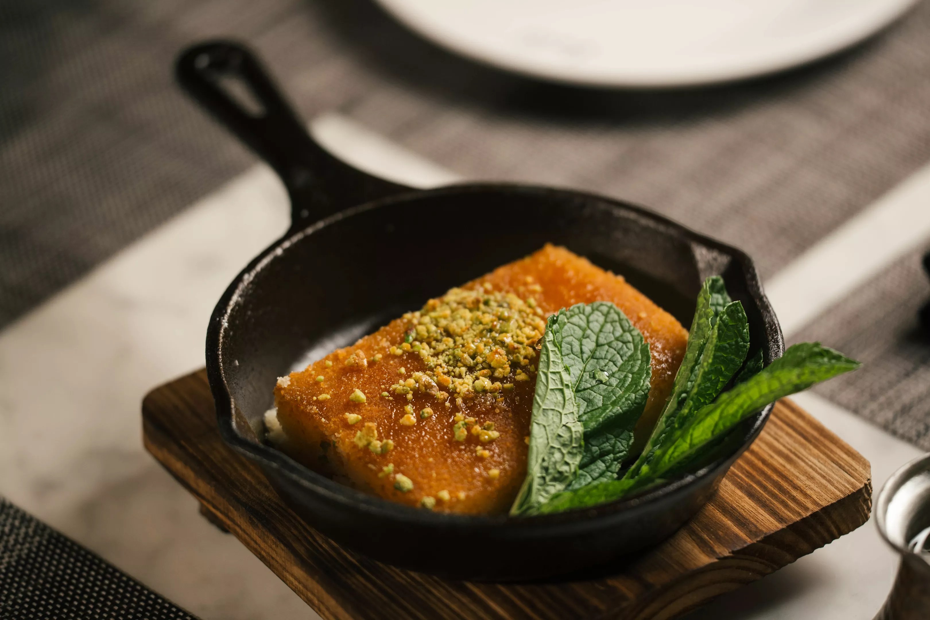 Knefeh, a traditional Middle Eastern dessert made with cheese and a sweet syrup poured over top.