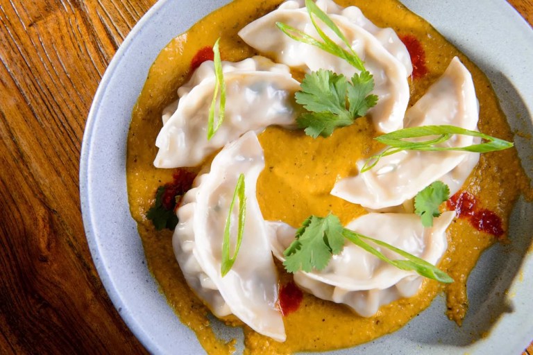 Steamed Nepalis spice dumplings immersed in signature Bajeko Sekuwa Sauce