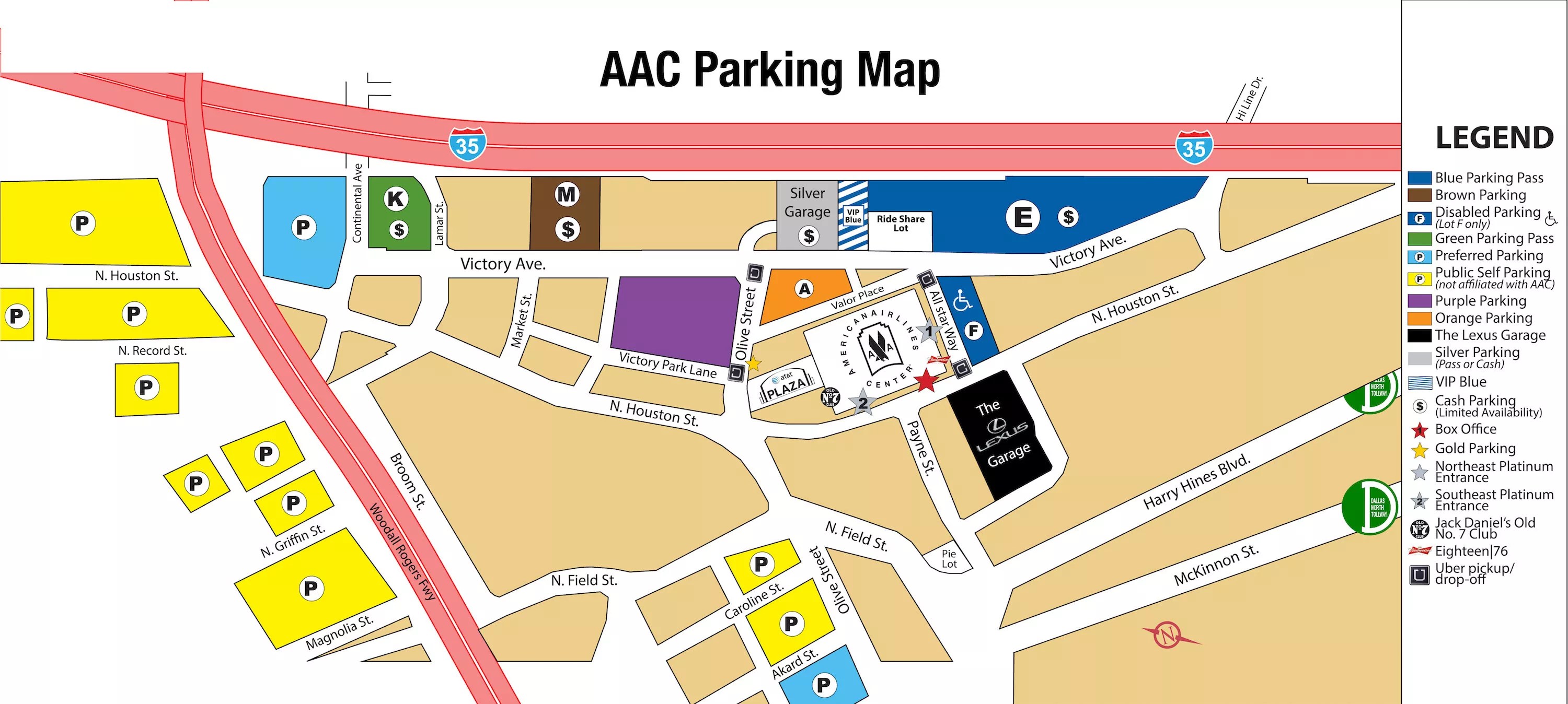 Parking passes purchased from AAC ticketing will be treated to four different preferred lots off Victory Avenue and Interstate 35’s service road for quick entry and exit. And handicapped spots are located directly across All Star Way from the venue’s northeast entrance.