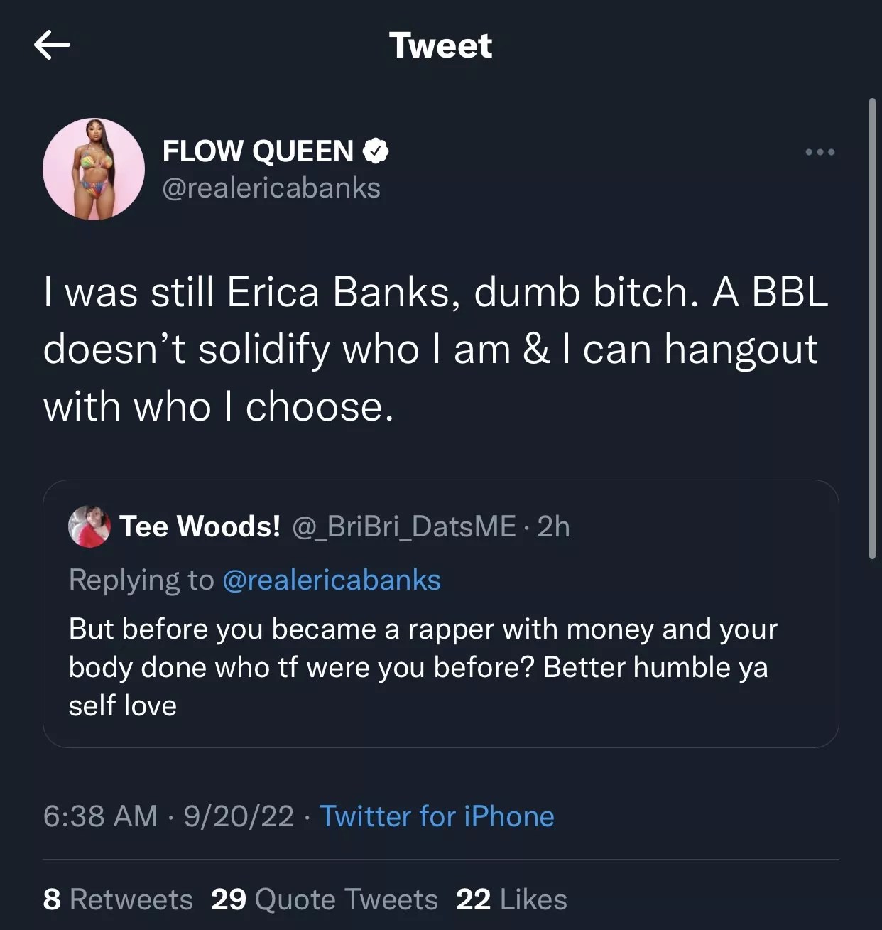 “I was still Erica Banks, dumb bitch. A BBL doesn’t solidify who I am & I can hangout with who I choose,” the rapper responded.