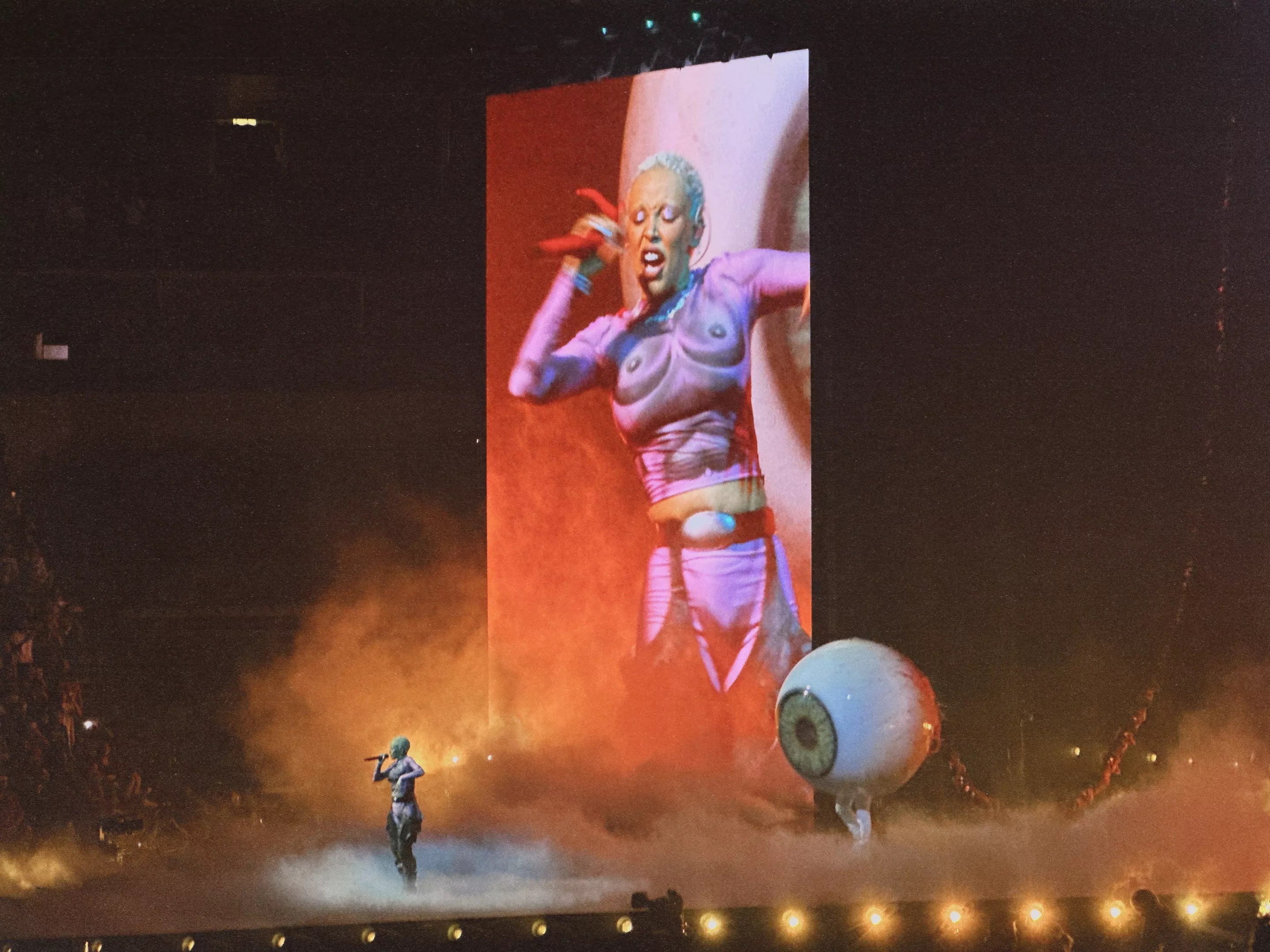 Several moments appeared to be posed with the giant LED screens in mind. During “Attention,” her backup dancers were arranged in a line in front of the camera with their arms in a circle above their head. On the lyric “look at me, look at me / you looking?” she looked down the tunnel of arms and into the barrel of the lens. Ironically, this was a moment that only worked if you weren’t looking directly at her.