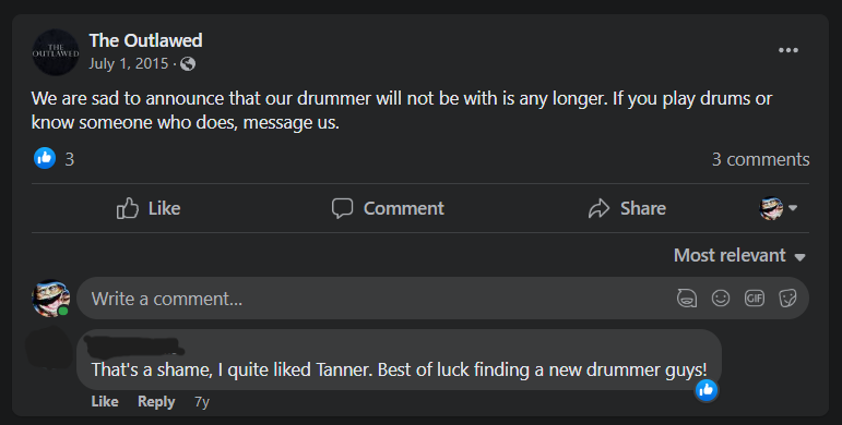 Horner left The Outlawed as its drummer in 2015 when the group posted a Facebook notice looking for a replacement. Attempts to reach a member of the group were blocked on Facebook.