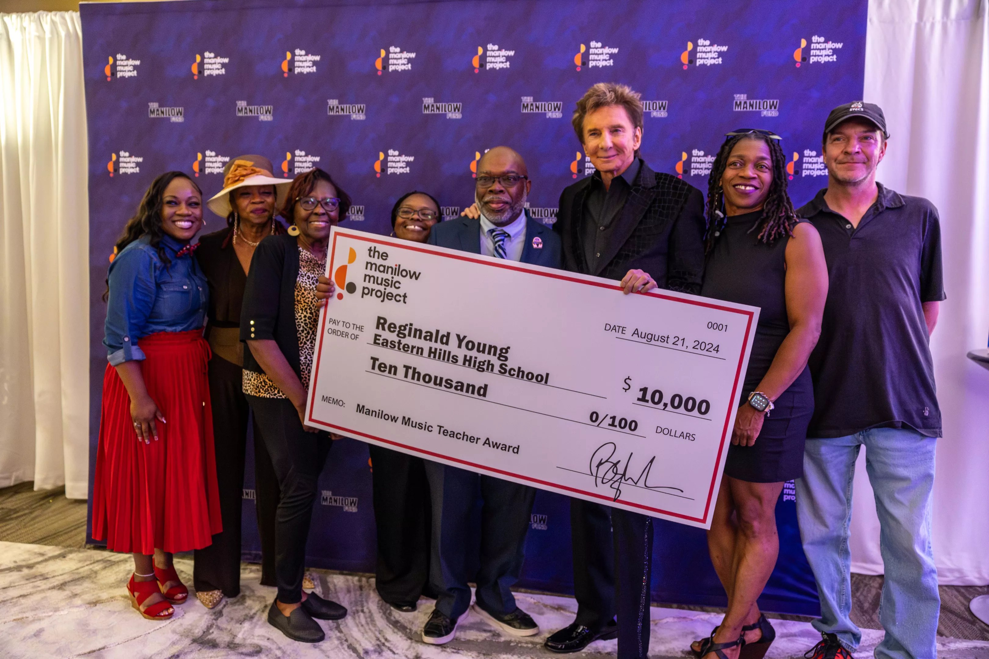 Barry Manilow presenting the giant check to Eastern Hills High School and teacher Reginald Young.