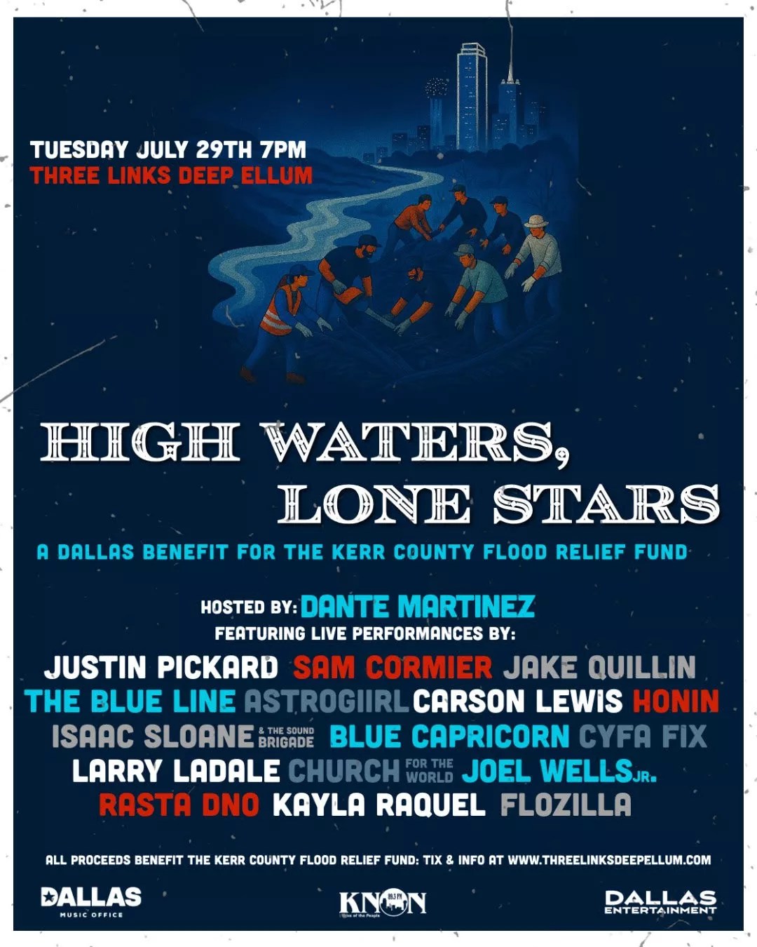 The Dallas Music Office, KNON and Dallas Entertainment Awards have teamed up to present High Waters, Lone Stars: A Dallas Benefit for the Kerr County Flood Relief Fund. Hosted by comedian Dante Martinez, the show will feature live performances by Justin Pickard, Sam Cormier, Jake Quillin, The Blue Line, Astrogiirl, Carson Lewis, Honin, Isaac Sloane & The Sound Brigade, Blue Capricorn, Cyfa Fix, Larry Ladale, Church for the World, Joel Wells Jr., Rasta Dno, Kayla Raquel and Flozilla. All proceeds will go directly to the Kerr County Flood Relief Fund.