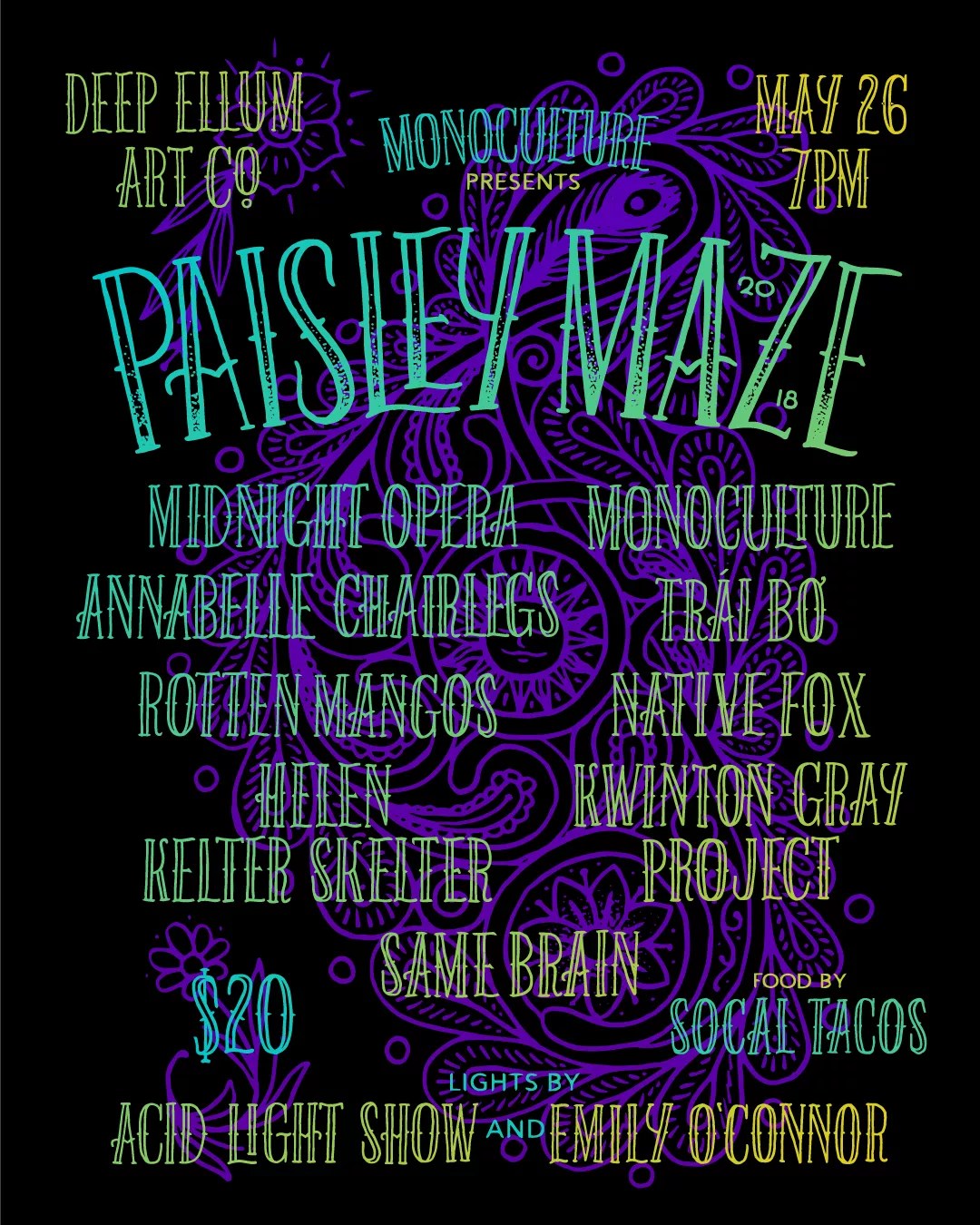 Tuesday, Monoculture announced the lineup for their annual Paisley Maze music festival going down May 26 at the Deep Ellum Art Company.