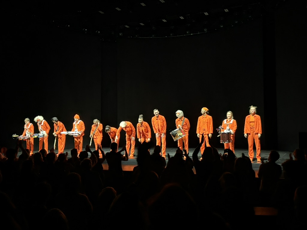 Byrne and his band entered wearing matching orange jumpsuits and sneakers, opening with a gorgeous stripped-down rendition of Talking Heads’ “Heaven,” before jumping into “Everybody Laughs,” the jovial opening track from Byrne’s new album with Ghost Train Orchestra.