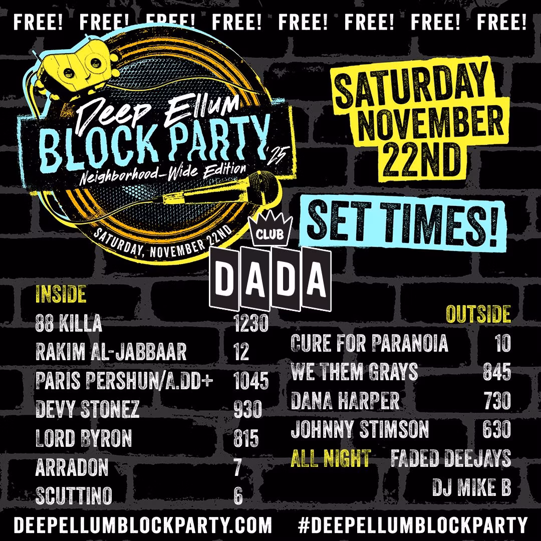 With the Deep Ellum Block Party commencing on the Saturday before Thanksgiving, the set times to see some of your favorite local artists have been announced.