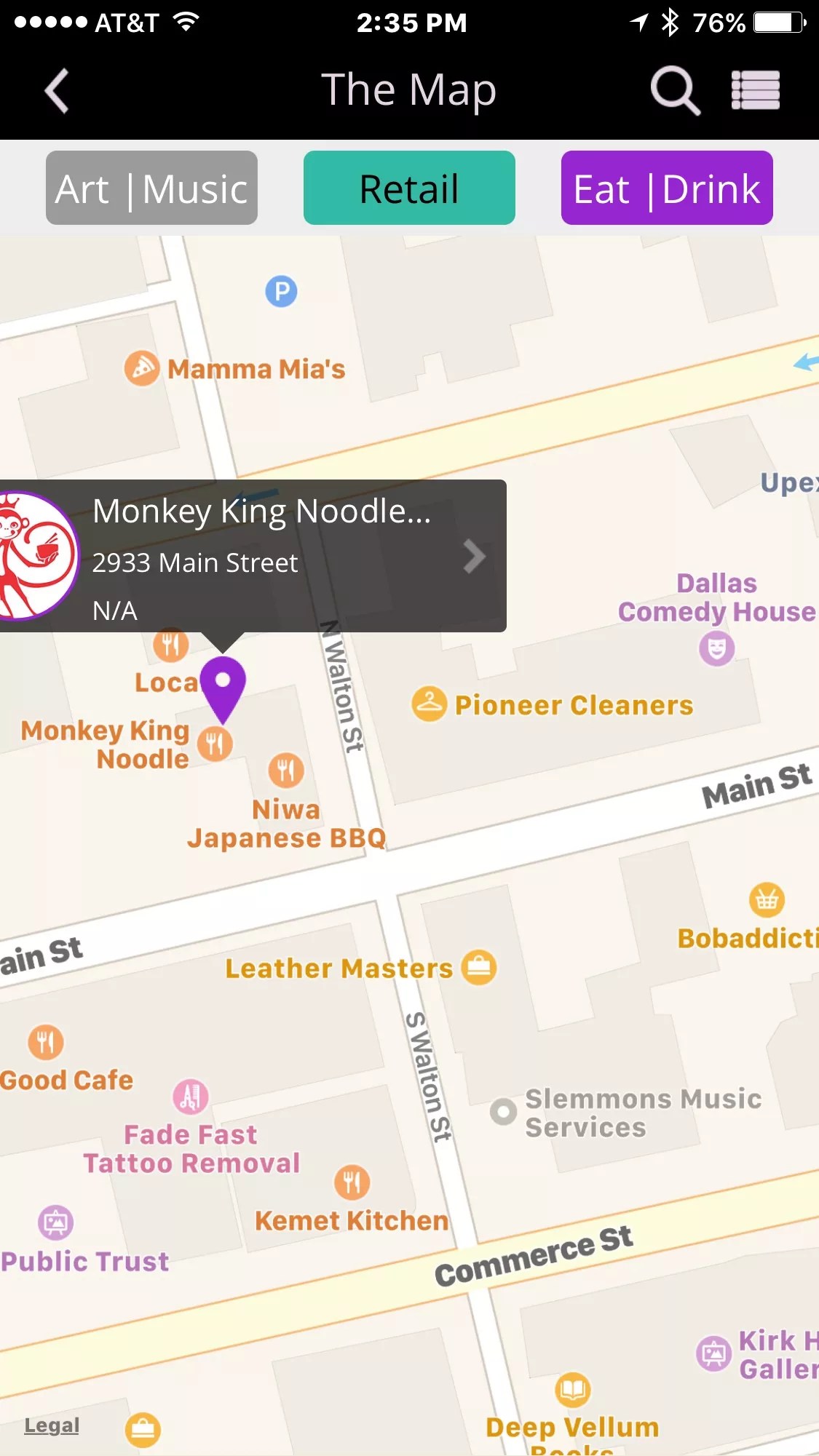 The Deep Ellum app’s map feature points out the neighborhood’s restaurants, entertainment venues and shops, some of which you have to zoom in pretty close to discover.