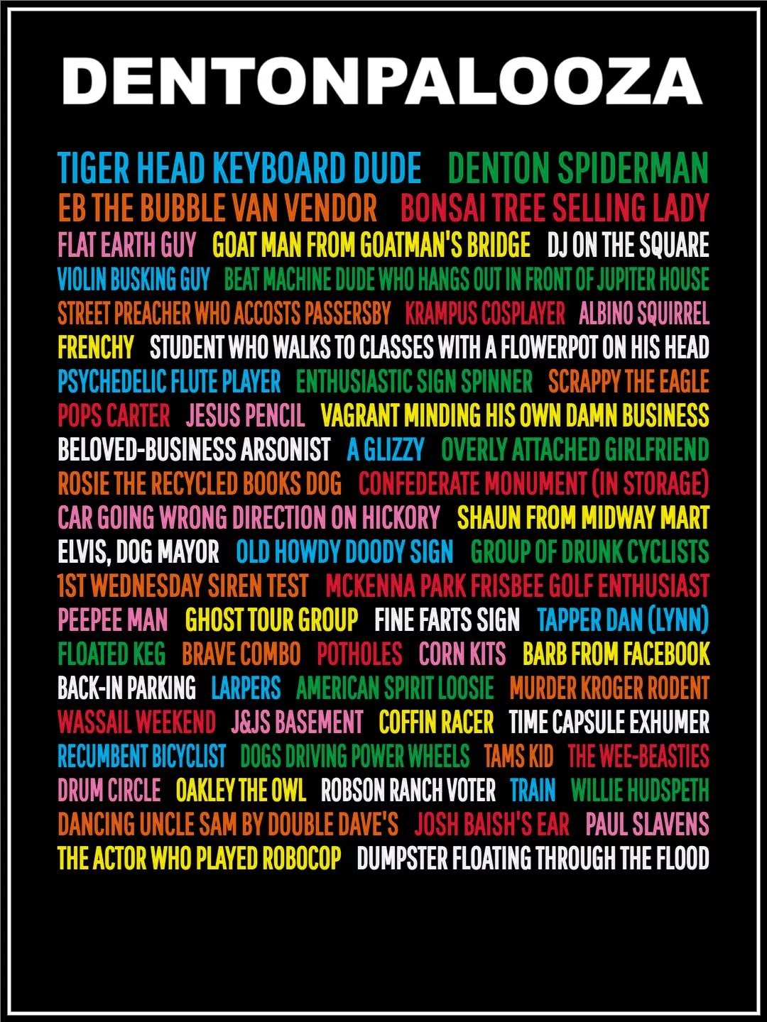 Liechty says the joke spiraled from there. After some input from Denton Facebook and Reddit pages, the first iteration of the Dentonpalooza flyer was born. It’s been a favorite on many feeds for the past several days, having been updated a few times after commenters thought of more Denton-specific characters to add.