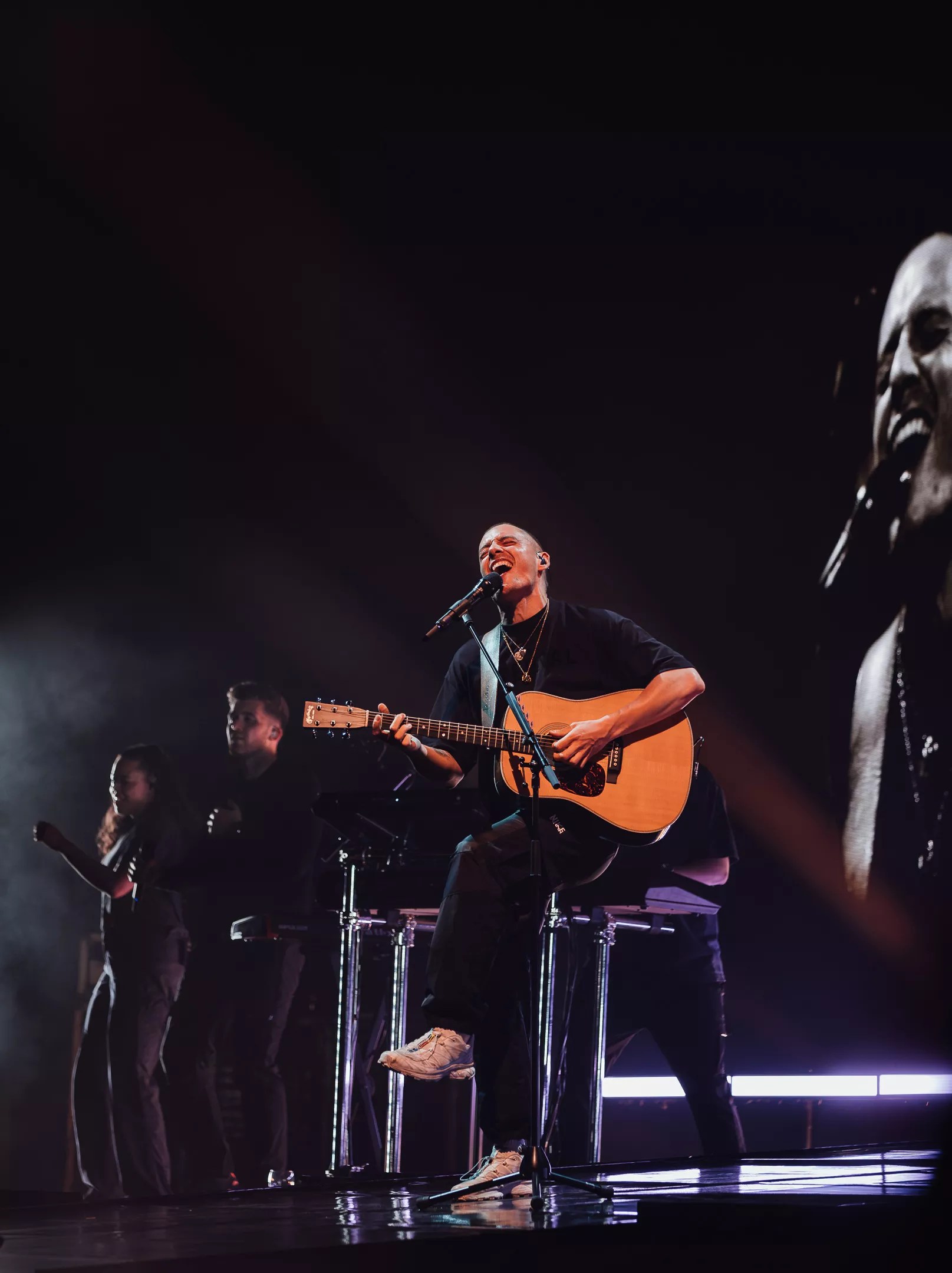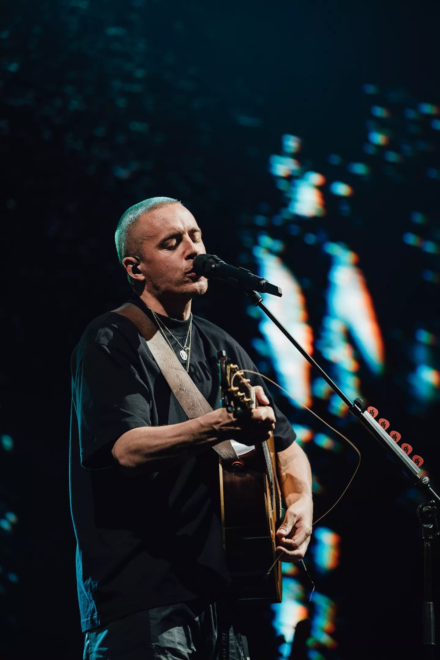 Dermot Kennedy giving his all, shredding out chords on his acoustic guitar.