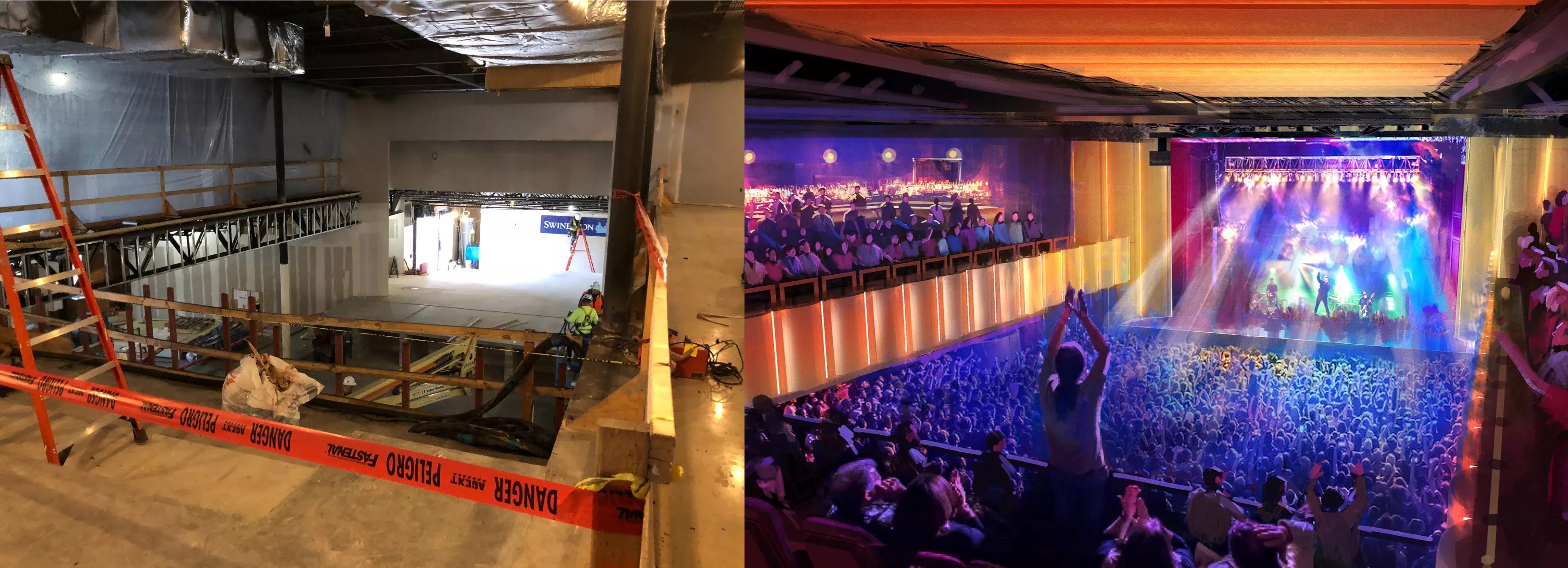 (Left) Crews are working on a new 1,000-person capacity music venue on North Stemmons Freeway. (Right) Live Nation released artistic renderings of what The HiFi will look like when it opens in May.