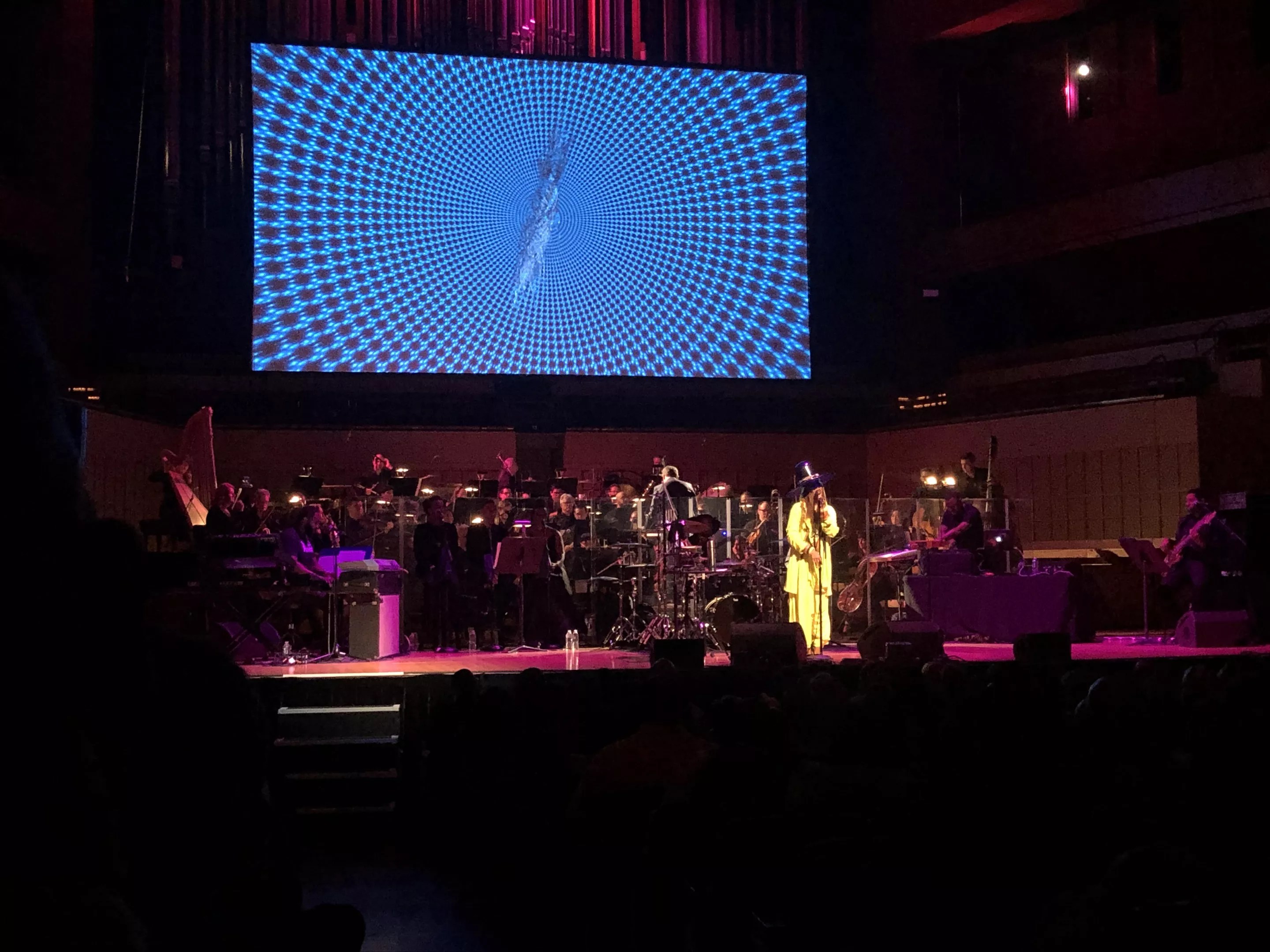 Erykah Badu stood, clad in what seemed like a Day-Glo bodysuit adorned with a tangle of various accoutrements, with her back to the audience. Above her, multicolored lights pulsed, and a projection screen displayed a riot of eye-popping images, cycling and spinning and melting into one another. Before her, seven backing musicians situated behind microphones, keyboards, drums, bass and a laptop, and beyond those bodies sat the Dallas Symphony Orchestra.