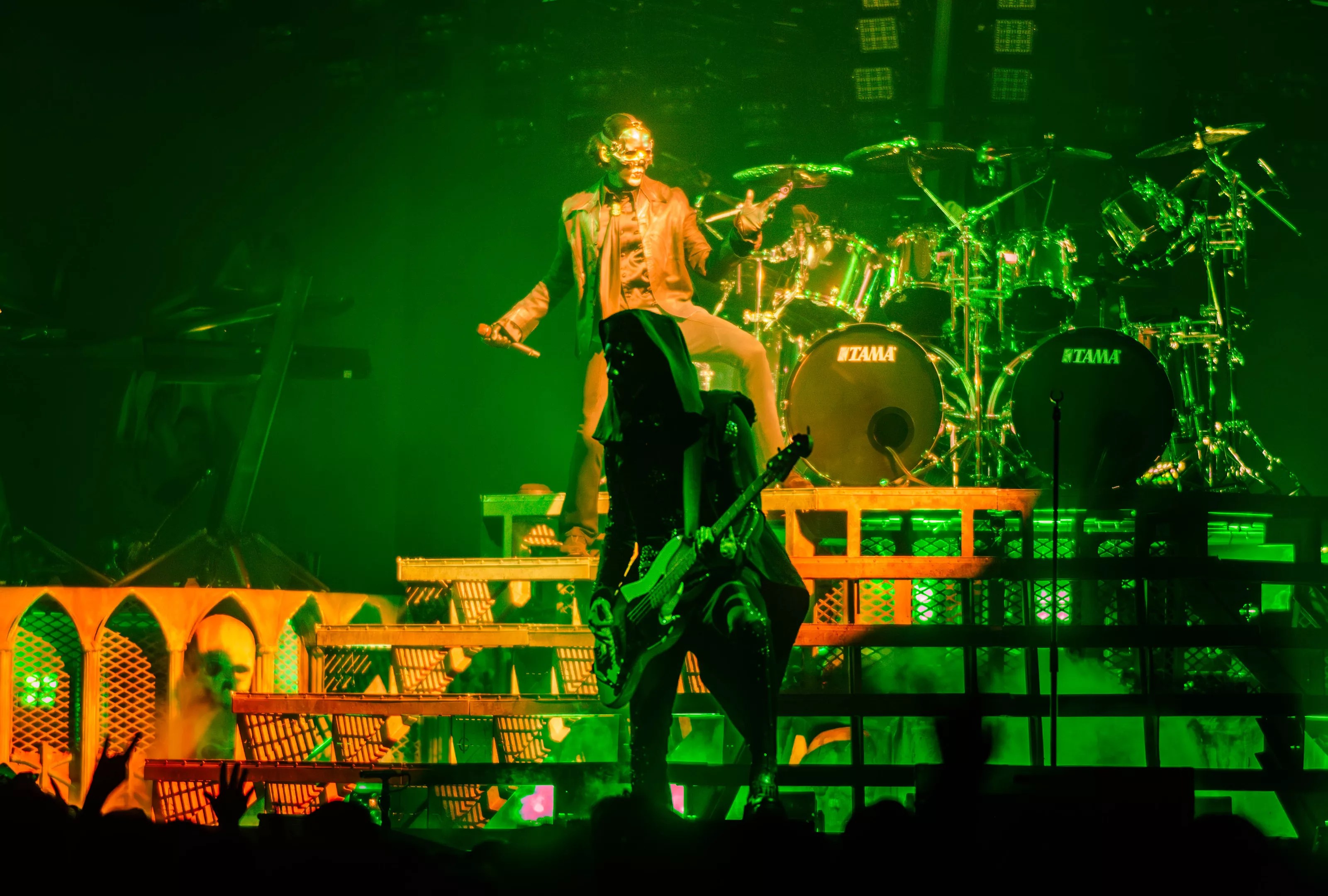 All at once, the purple ambient lighting shut off, the crowd stood up to cheer and the opening strains of “Peacefield” – the first track from Skeletá, released in April 2025 – rang out from behind the curtain. All eyes turned towards the stage. The black drapes dropped to the floor, revealing the masked Nameless Ghouls on drums, keyboards, bass, guitars and background vocals, dressed in black attire with sparkling crystals highlighting their creepy costume wings and bones. Lead vocalist Tobias Forge, fully in character as Papa V Perpetua, joined the group onstage to enthusiastic applause.