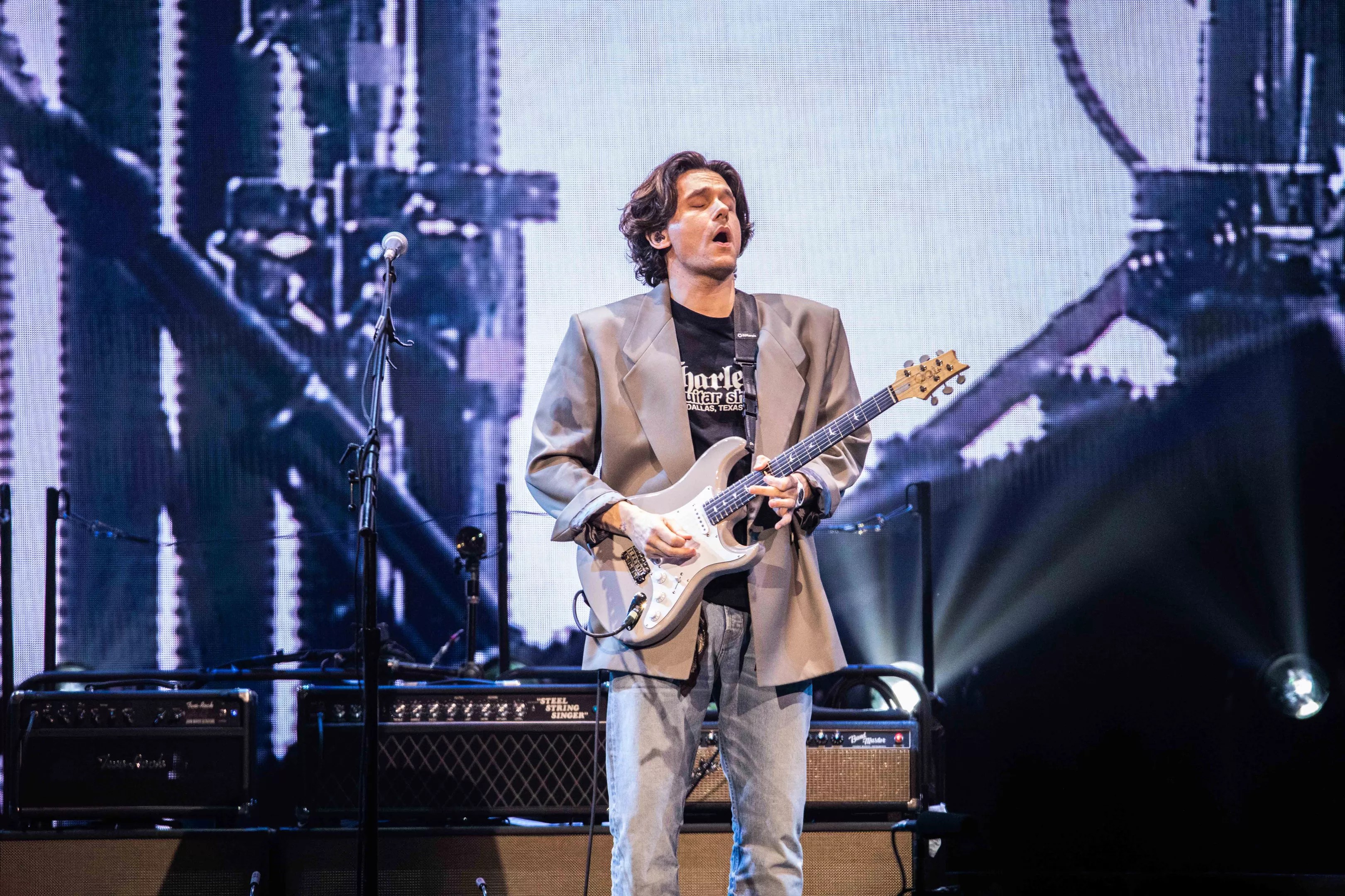 Considered as a whole, Sunday’s set list was decidedly downbeat, ranging from “I Don’t Trust Myself (With Loving You)” and “Who Says” to “Still Feel Like Your Man,” “If I Ever Get Around to Living” and the main set-closing “Gravity,” into all of which were tucked gorgeous guitar runs and electrifying call-and-response between Mayer, who spent much of the set clad in a black Charley’s Guitar Shop T-shirt, and his bandmates.