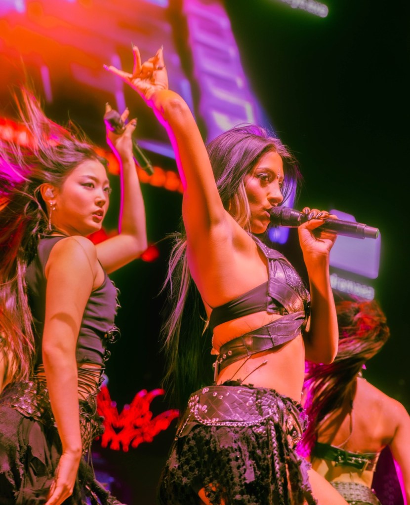 Fans of all ages, most draped in some form of black, leather or bejeweled clothing, shivered in unison outside the 8,000-seat amphitheater. Parents escorted children who aren’t old enough to roam the streets by themselves, their blue jeans clashing with the bare legs of the majority who did not dress for the 40-degree weather. There isn’t a handheld sign bearing the band’s faces in eye view, a common sight at shows like TOMORROW X TOGETHER (HYBE) and ATEEZ (KQ Entertainment). Yet, elements of the multi-billion-dollar music style are all around. For one, K-pop fans do not play about their attire. One EYEKON — the name for the group’s fans — poses in front of the box office in a white wedding dress in a nod to concept photos for the group’s bilingual title track “Gabriela.” Inside the venue, ticket holders in the merch line swap stories about seeing genre favorites such as IVE and LE SSERAFIM in concert. Rows of foldable chairs on the floor appear like a Christmas tree, illuminated by both $69 light sticks and flash photos.