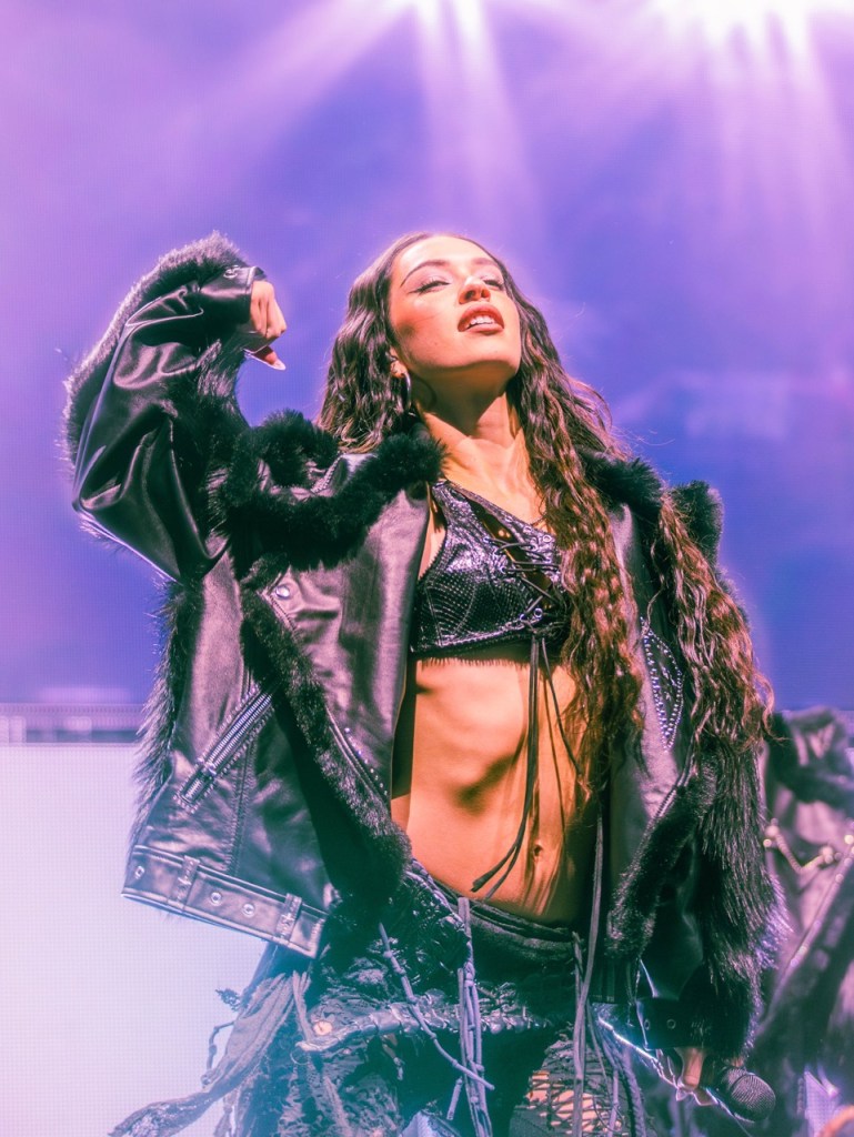 But once the girls hit the stage at 8:35 p.m., their dark shadows appearing against a black-and-white backdrop mimicking paparazzi-style flashing cameras, the screaming begins and doesn’t stop. KATSEYE opens with “Debut,” their first original song as one, though, as the lyrics suggest, it is still not a debut in terms of K-pop (in which it refers to the formal launch of an artist via a song or music video). It’s 123 seconds of punchy dance moves, characterized by diva-like hip movements and high kicks. Their attire shows that EYEKONS pay attention. The girls appear so similar to their fans while in their black, furry ensembles that a chaperon wouldn’t have looked twice had they roamed the venue grounds. Later, it becomes clear that the members’ relatability and openness are what set them apart from not just HYBE’s K-pop roster, but even pop phenomena like Tate McRae and Sabrina Carpenter. Background performers lift Sophia into a mini-stunt during a dance break that reflects the blare of a cheer routine remix, complete with ad-libs, repeated lyrics and dramatic sound effects. The girls follow suit, executing the added choreography with high energy.