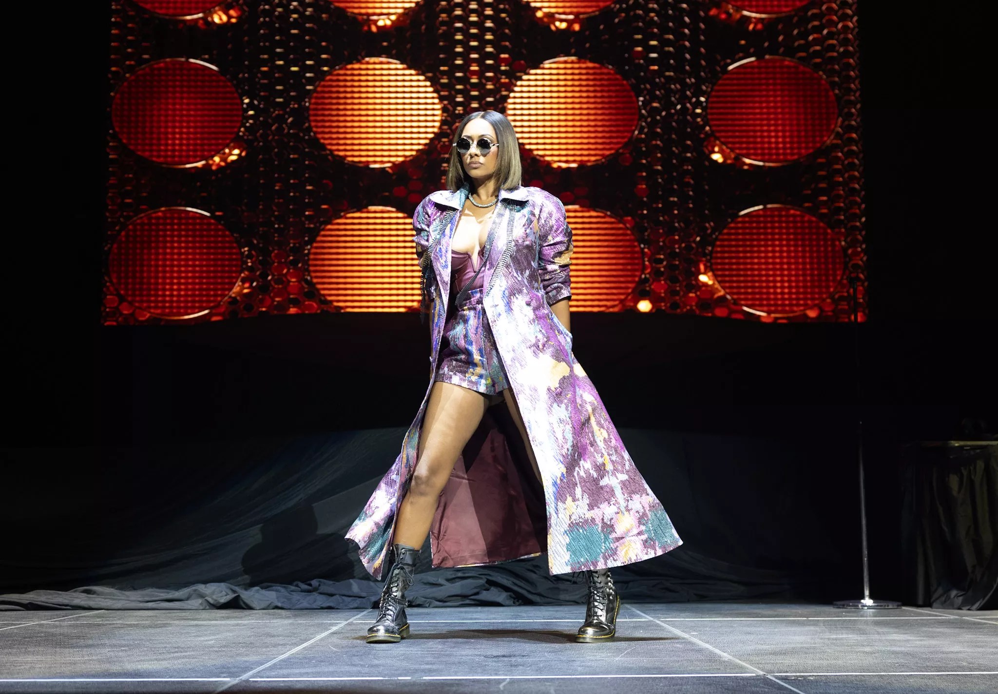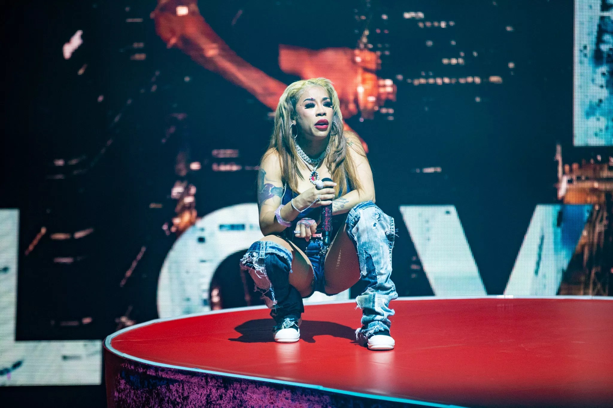 Finally, the moment everyone in the arena had been waiting for, Cole graced the stage. Flashing lights and wailing sirens opened the show, spotlighting a solitary telephone booth by a chain-link fence as a pre-recorded monologue about chasing dreams set the stage. Suddenly, she appeared atop a giant, red velvet-draped heart, wearing a fitted denim top, sparkling silver-studded shorts, knee-high boots and layers of diamond jewelry. Holding a bedazzled red microphone, backed by a live band featuring drums, guitar, piano and powerhouse backing vocalists, she sang “Guess What?” from The Way It Is to initiate the set.