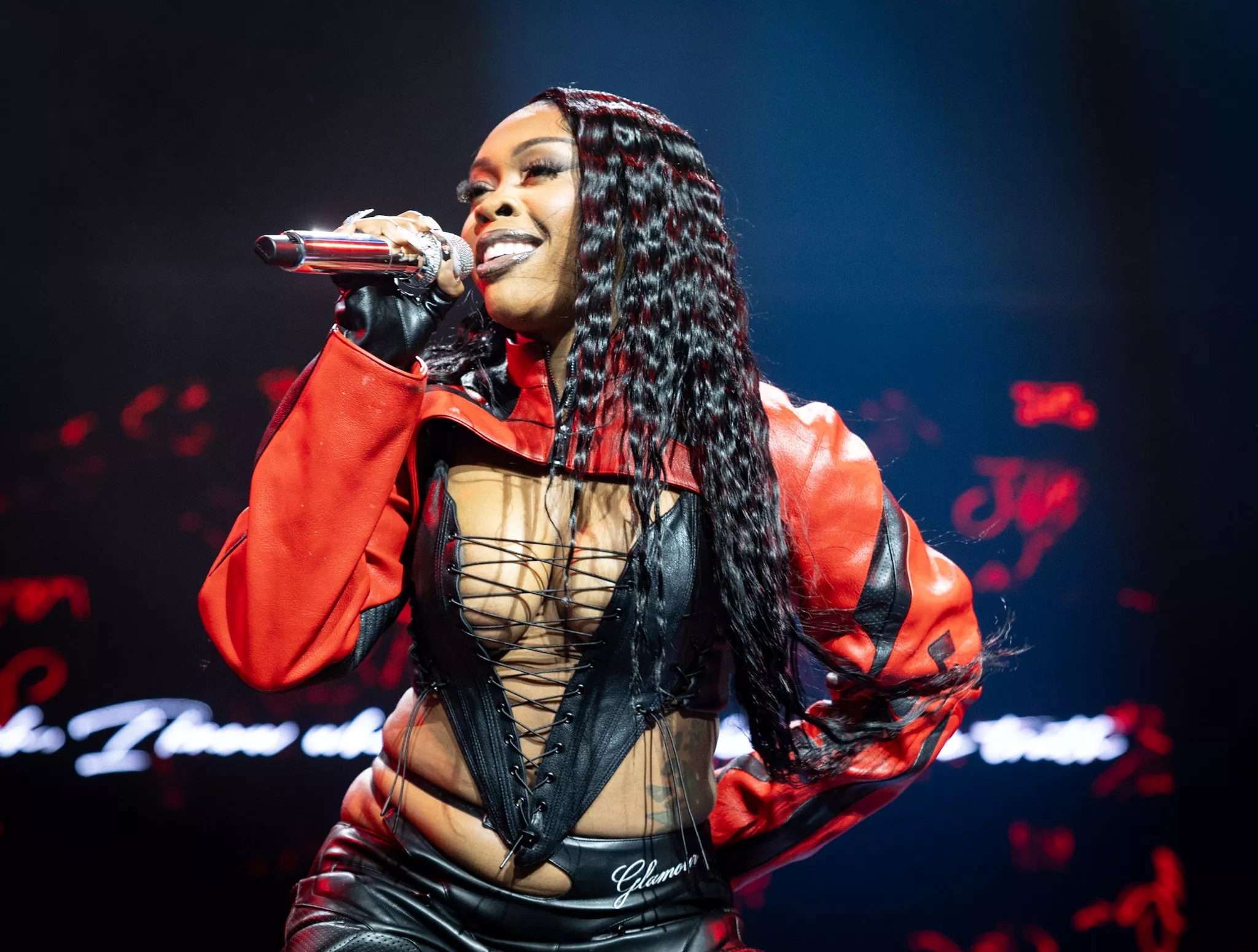 After the “All The Way” rapper’s surprise appearance, a black-and-white video montage of her California drive before reappearing in an all-red bodysuit with feathery chaps for “Last Night” and “Enough of No Love.” Reflecting on two decades of hits, she thanked fans for their support throughout her music career.