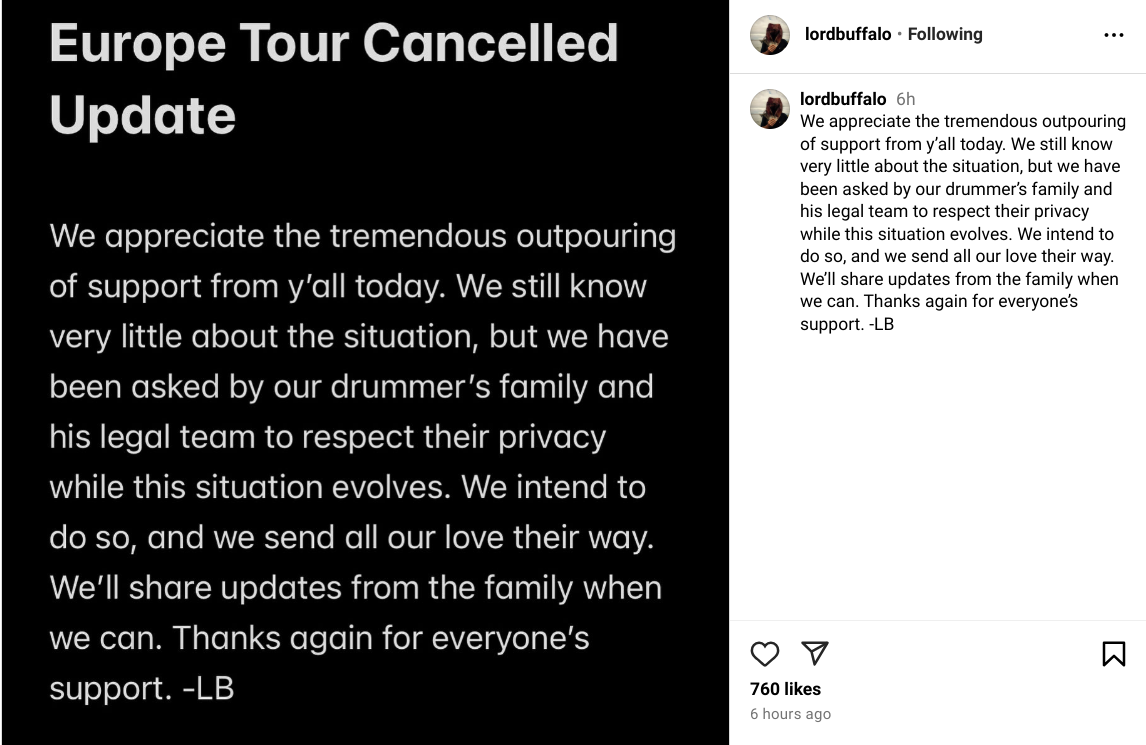 In an update on Instagram, Lord Buffalo wrote, “We appreciate the tremendous outpouring of support from y’all today. We still know very little about the situation, but we have been asked by our drummer’s family and his legal team to respect their privacy while this situation evolves. We intend to do so, and we send all our love their way. We’ll share updates from the family when we can. Thanks again for everyone’s support.”