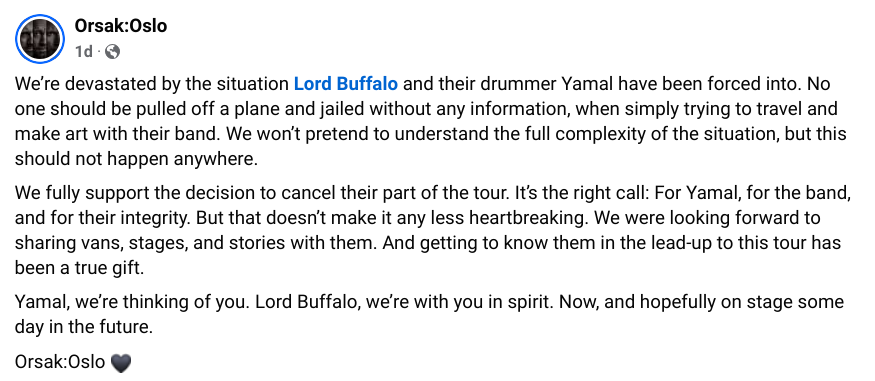 “We are currently working with an immigration lawyer to find out more information and to attempt to secure his release,” the band wrote. “We are devastated to cancel this tour, but we are focusing all of our energy and resources on Yamal’s safety and freedom. We are hopeful that this is a temporary setback and that it could be safe for us to reschedule this tour in the future. In our absence, our touring partners Orsak:Oslo will continue to perform the tour. We urge everyone to go see this amazing band and support them over the next couple weeks.”