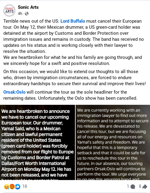 “We are heartbroken to announce we have to cancel our upcoming European tour,” the band wrote. “Our drummer, Yamal Said, who is a Mexican citizen and lawful permanent resident of the United States (green card holder) was forcibly removed from our flight to Europe by Customs and Border Patrol at Dallas/Fort Worth International Airport on Monday May 12. He has not been released, and we have been unable to contact him.”