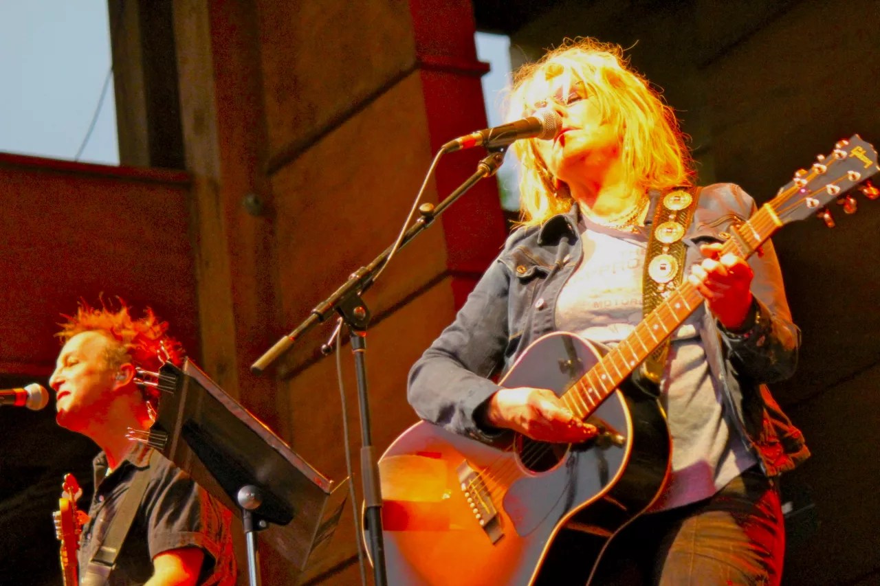 Appearing at the 2016 Rocky Mountain Folks Festival in Lyons, Colorado, Lucinda Williams performs with bassist David Sutton.