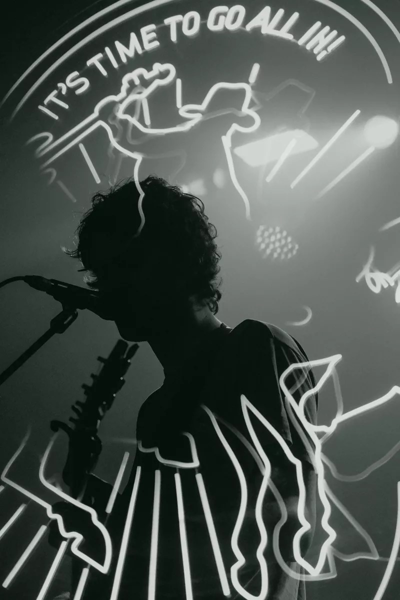 When it was time for the show to begin, Lenderman and the band shuffled onto a hazy stage, his and the features of the band melting into the atmosphere. He donned a t-shirt and jeans, looking much like the members of the crowd clad in workwear and patchwork tattoos themselves. A projection of art done in the style of the album cover, Manning Fireworks, was splayed out behind the band members. The tones of the band members in the low light against the painterly strokes of the projection turned the stage into a work of art.