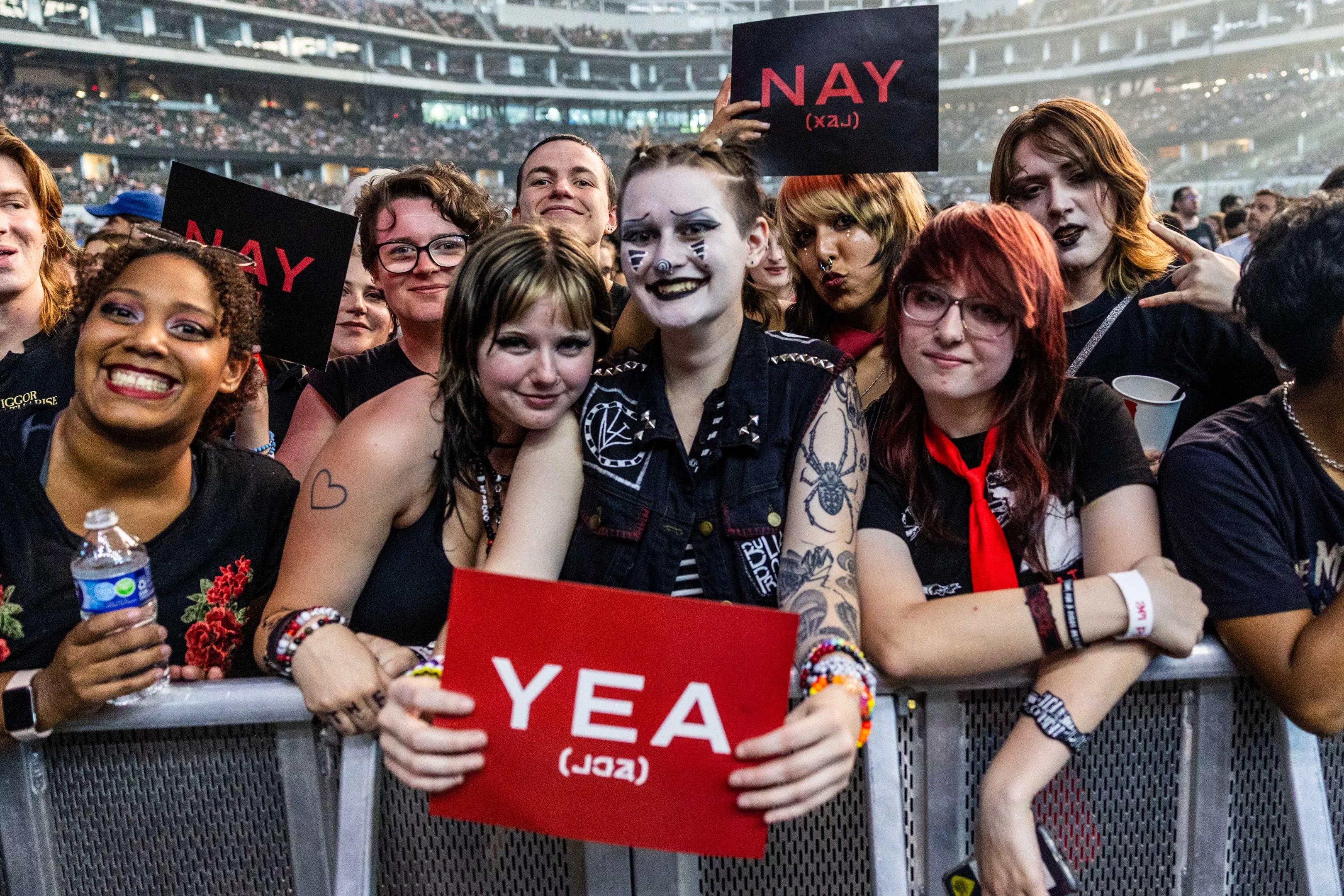 Fans holding up “yea” or “nay” signs to interact with My Chemical Romance.