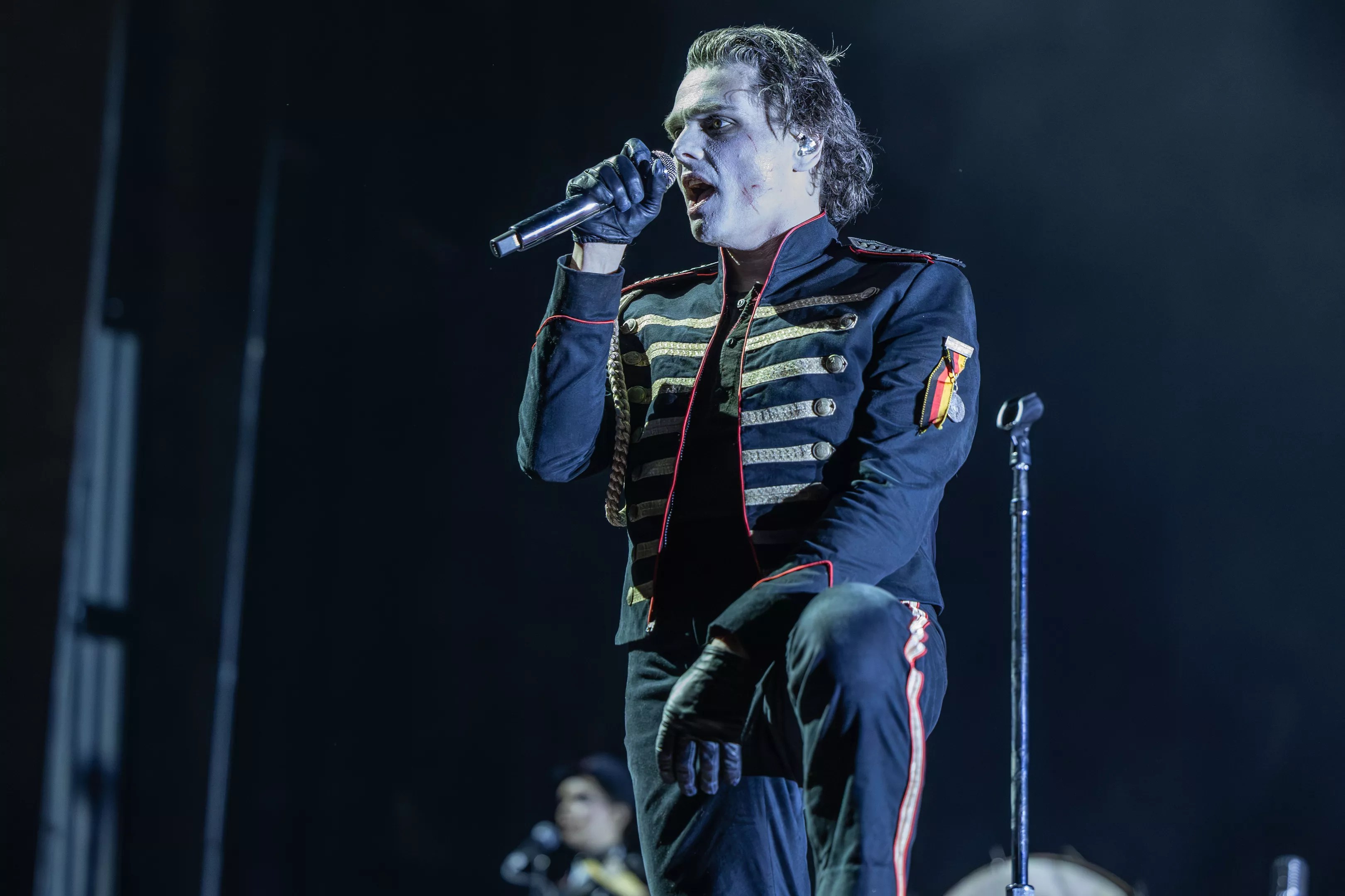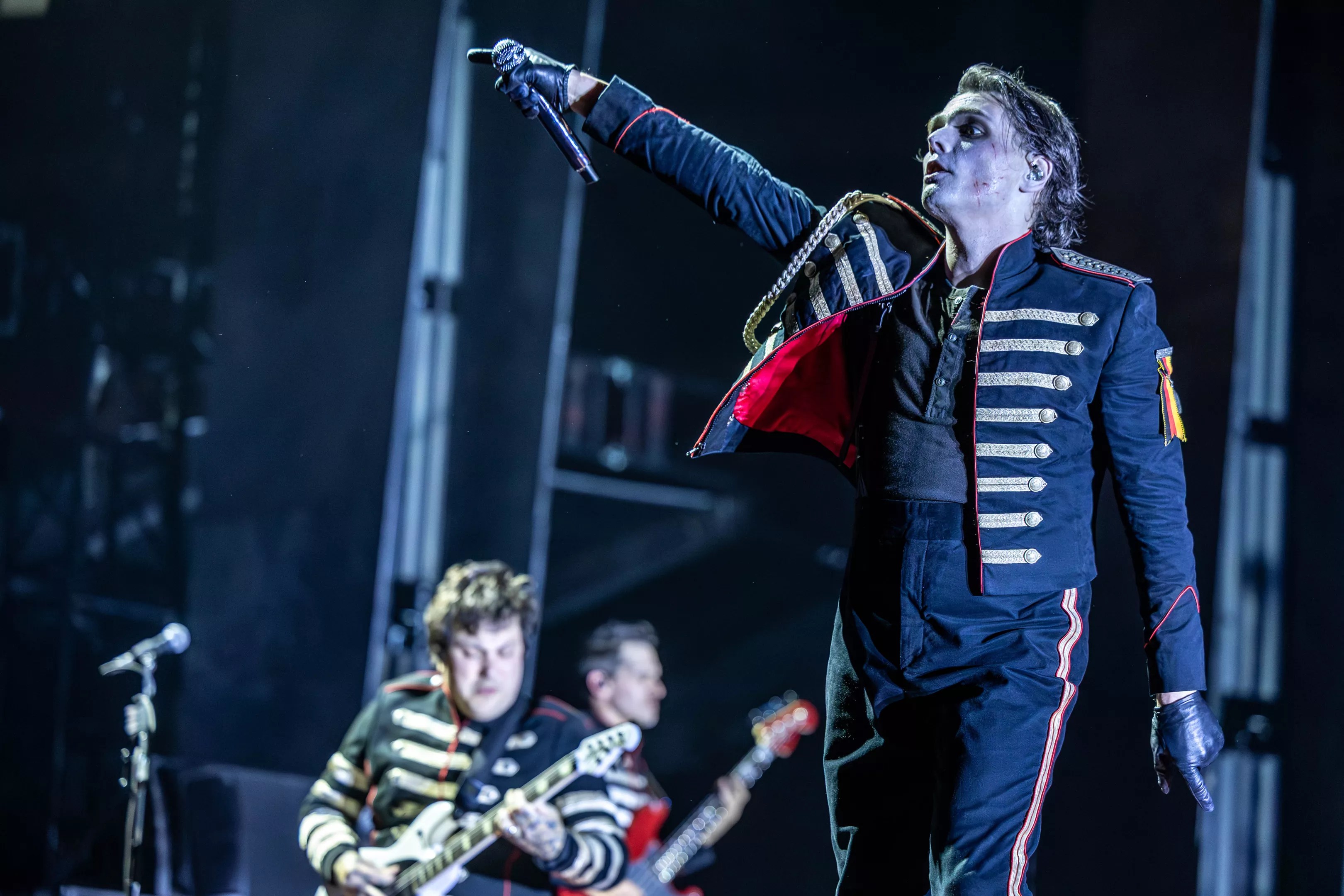 Way is a practiced showman and masterfully commanded the crowd, strutting about the stage in his military band uniform, his character playing like the demonic offspring of The Emcee from Cabaret and Heath Ledger’s Joker. At one point, the audience voted on whether four people who questioned “the vitality” of the Grand Immortal Dictator should be put to death. Red “yea” and black “nay” signs were available throughout the venue before the show, and the crowd held them high. “It’s a lot of fucking red!” cackled Way, before saying he could tell the vote was close and decided it was best to give the people what they want – ordering the criminals “executed” by firing squad on stage.