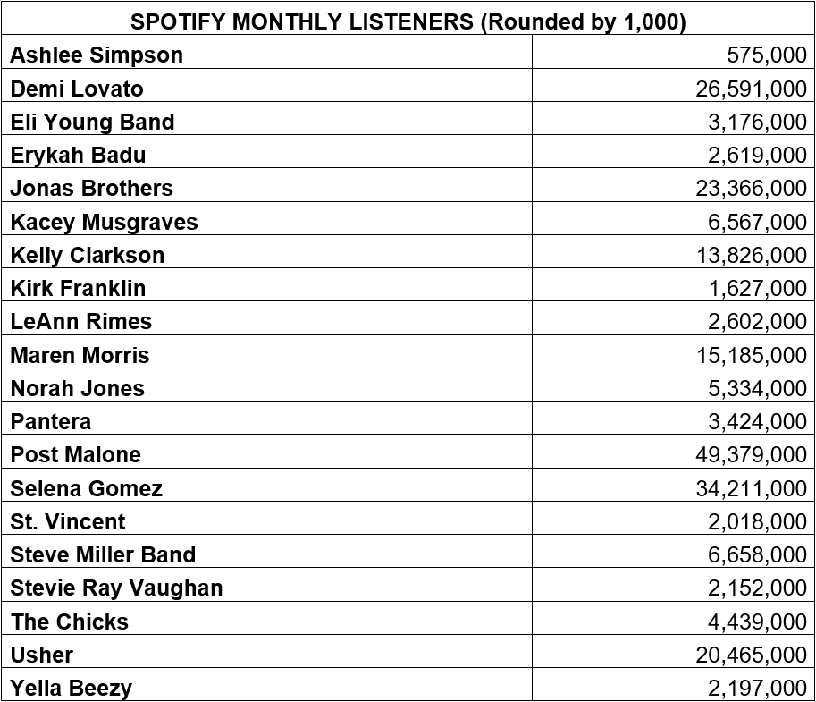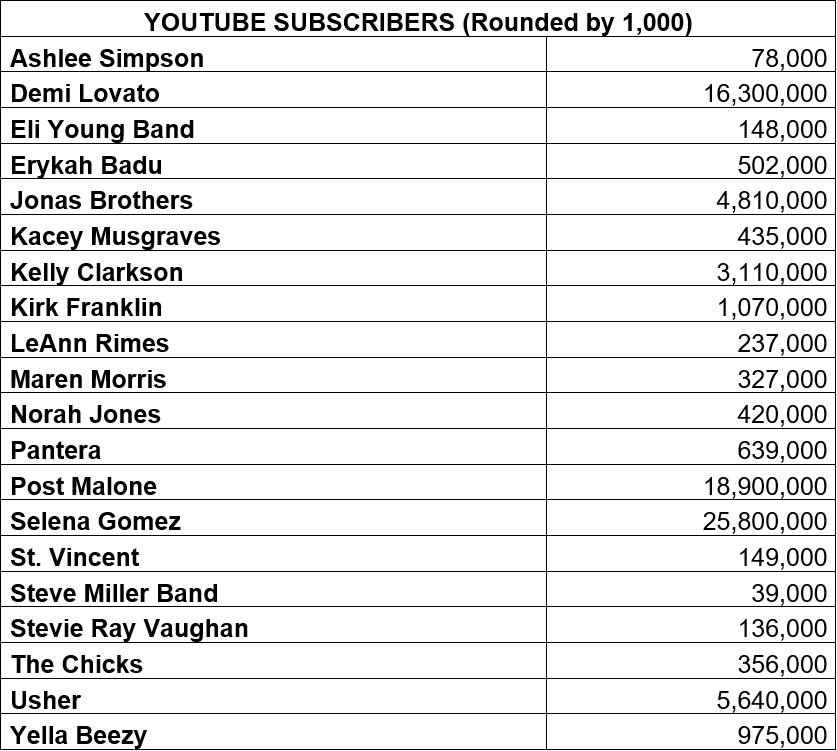Selena Gomez, Post Malone and Demi Lovato lead this list. We see a relatively similar trend with these artists’ numbers of monthly Spotify listeners, only Posty nearly doubles Lovato’s numbers. It’s also apparent that Spotify is a more conducive platform for country music than YouTube, as Eli Young Band has around 20 times more monthly Spotify listeners than YouTube subscribers. Maren Morris has about 46 times more.