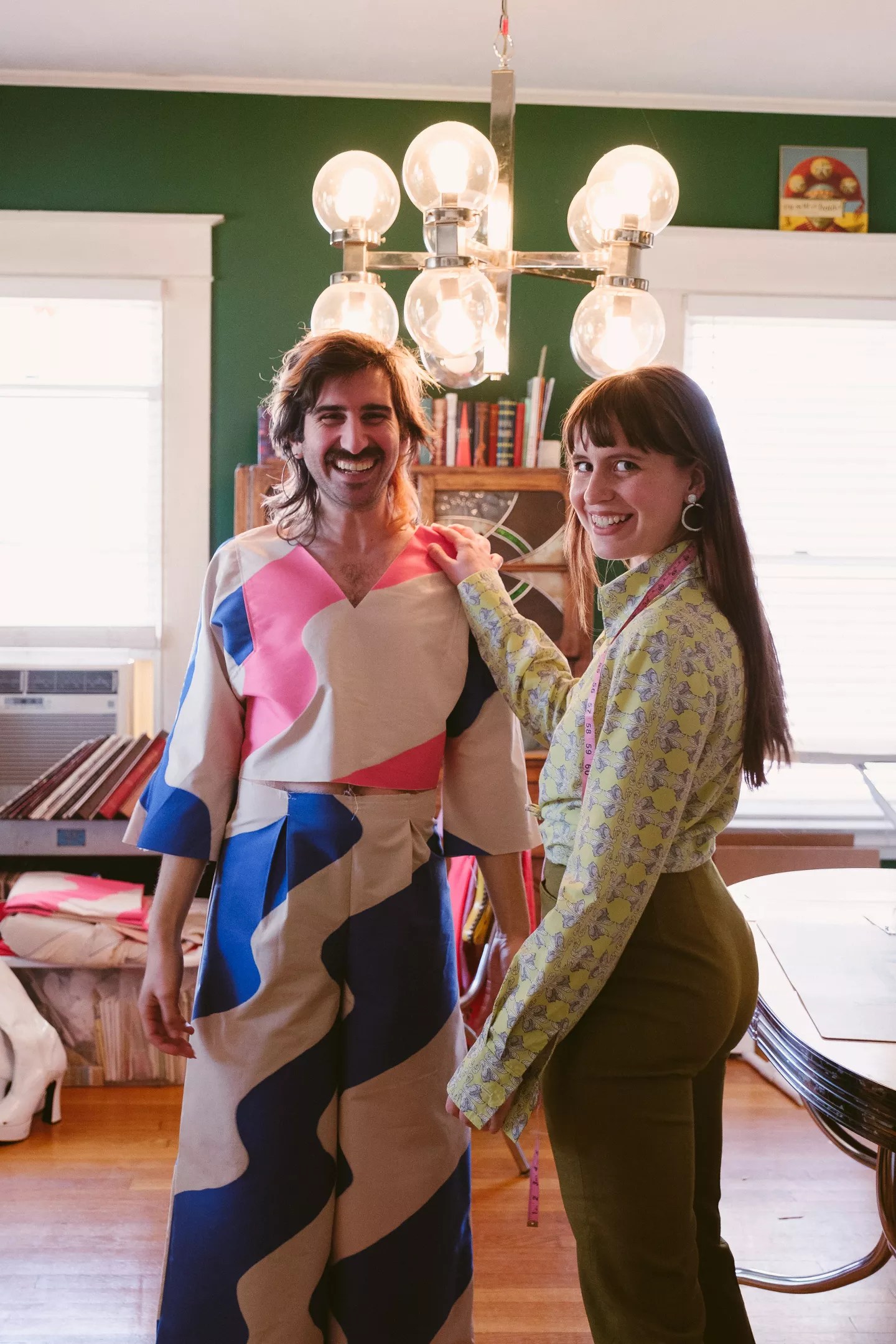 Teddy Georgia Waggy poses while admiring her handiwork alongside model and frequent design collaborator Colton White.