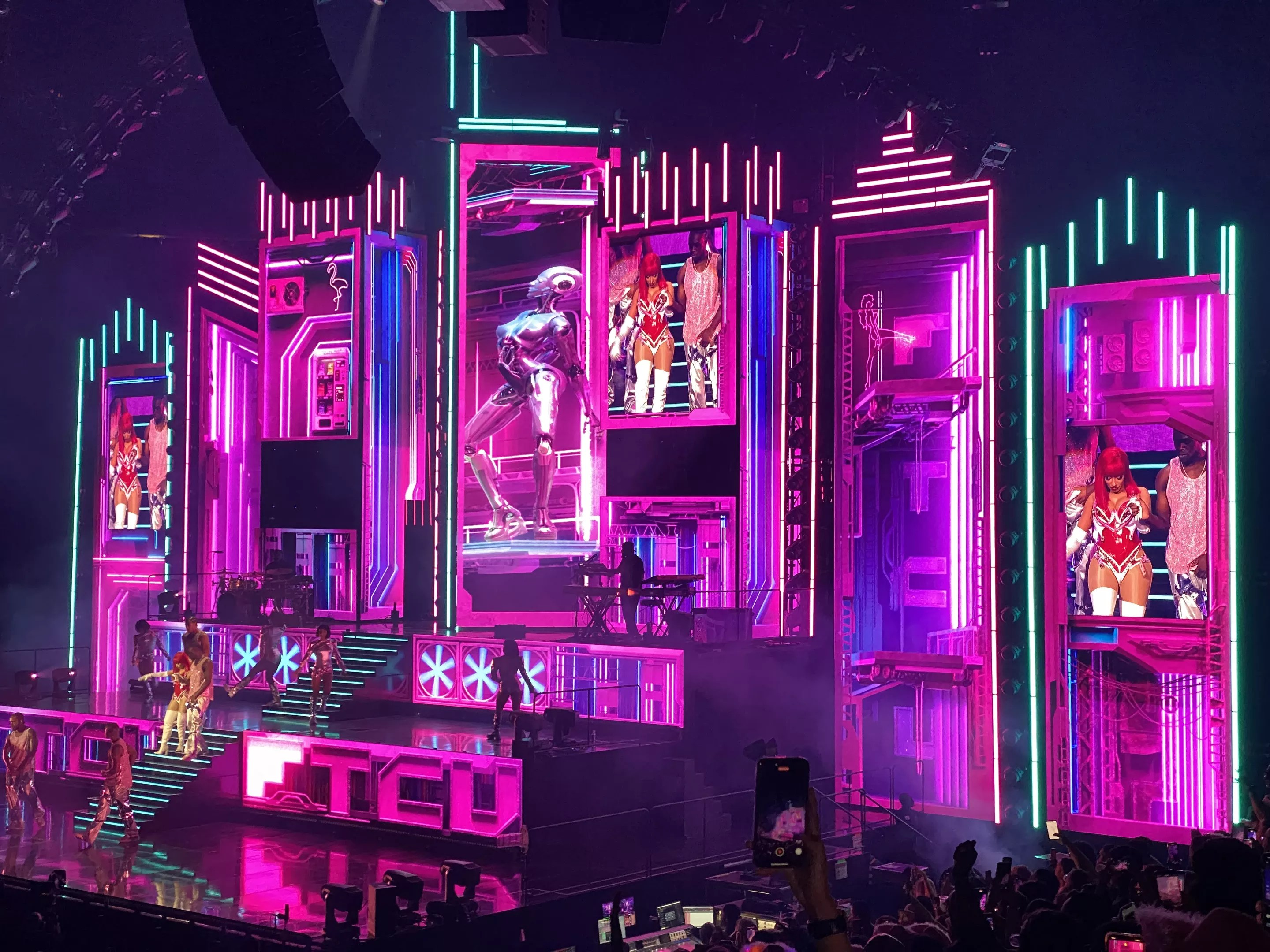 The view of the plane descending from puffy pink clouds upon neon skyscrapers amid a sugary sweet surrealist urban landscape evoked the magic of Gag City, the fictional setting where Minaj’s Pink Friday 2 album lives. It’s a futuristic girly-pop world of glitz and glam – home to the Barbz of past, present and future. It’s Tokyo-inspired, but drenched in femme fantasy for the fanbase that’s granted the queen of rap the highest-grossing tour revenue of her 17-year music career.