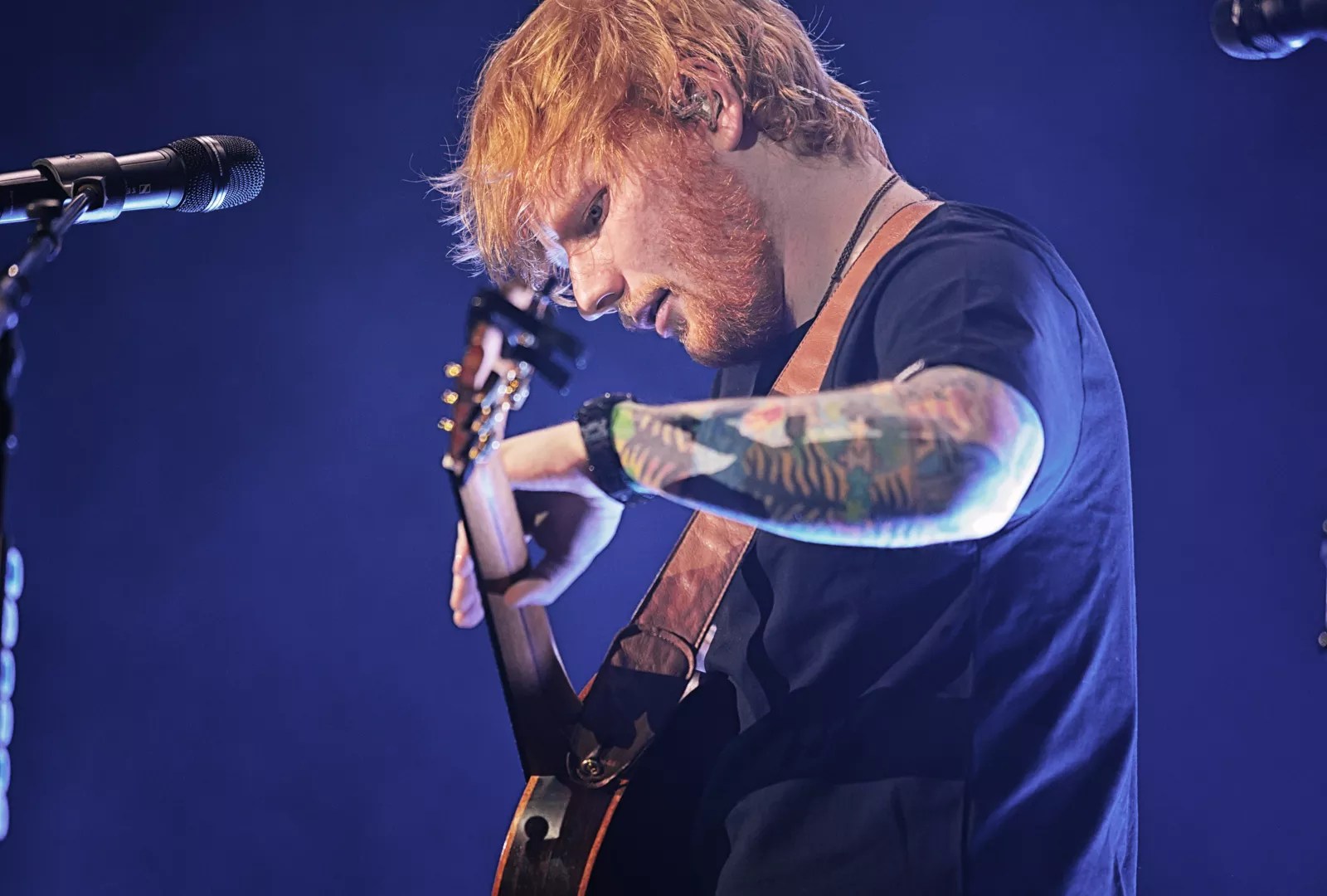 No band. Just Sheeran, two mics, a loop pedal and a guitar, that’s it.
