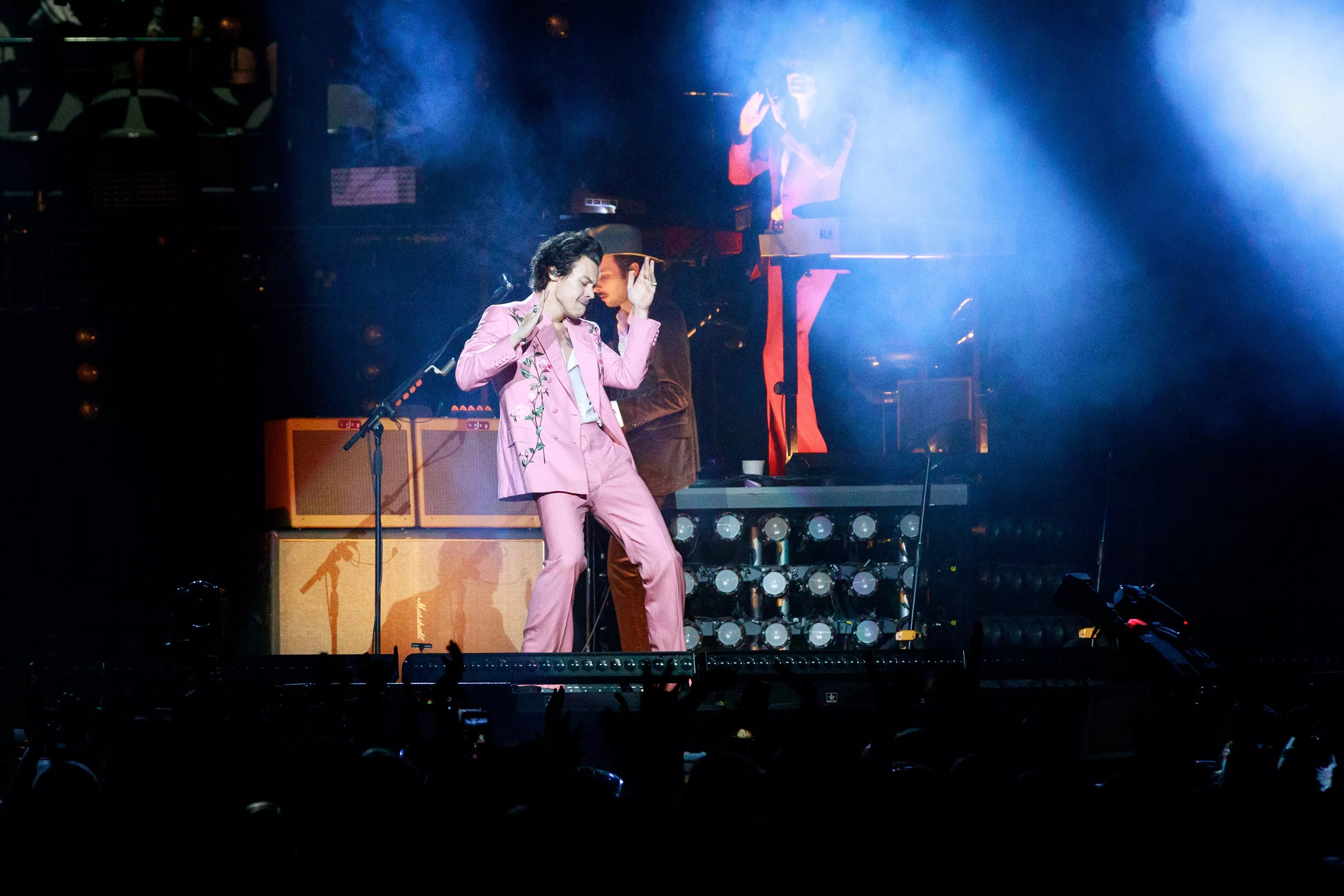 For all the chic nonchalance Styles exudes, there’s a boyish enthusiasm to how he approaches his music, and it was uncorked from the get-go Tuesday as he bounded around the circular stage during the opener, “Only Angel.” Strutting and shaking his hips in his pink lounge suit, he had all the requisite sass and moves like Jagger, delivered with a twist as he clapped his hands overhead and ran excitedly in place. No amount of arch posturing could hide the simple pleasure he derived from performing.