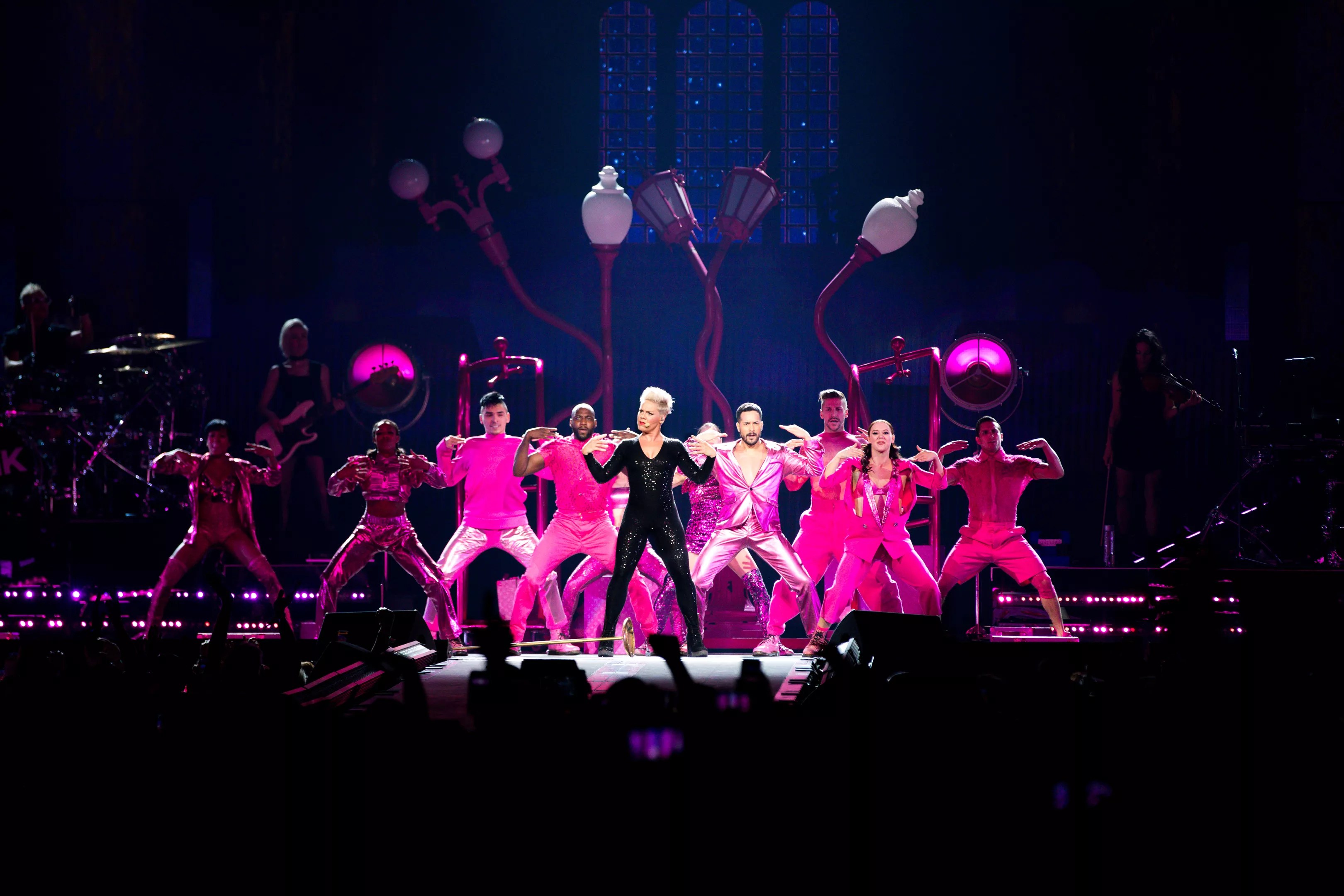 Pink was only too happy to oblige, exploding onto the stage with “Get This Party Started,” suspended from a warped-looking chandelier, as her eight-piece band and 10 dancers arrayed themselves on the enormous stage below her. It was a giddy adrenaline spike, watching the 39-year-old pop star swing to and fro, absorbing the raucous cheers and setting the tempo for the 110-minute set to come.