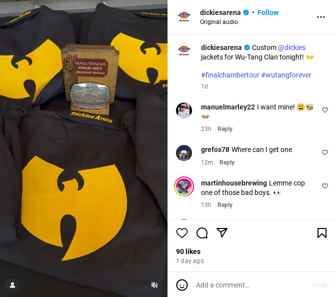 1. Custom Dickies jackets. Hours before Wu-Tang Clan and Run the Jewels hit the stage, the Dickies Arena Instagram account showed off some custom jackets for the members in commemoration of their sold-out show. We hope they sell these on Wu-Tang’s online store soon.