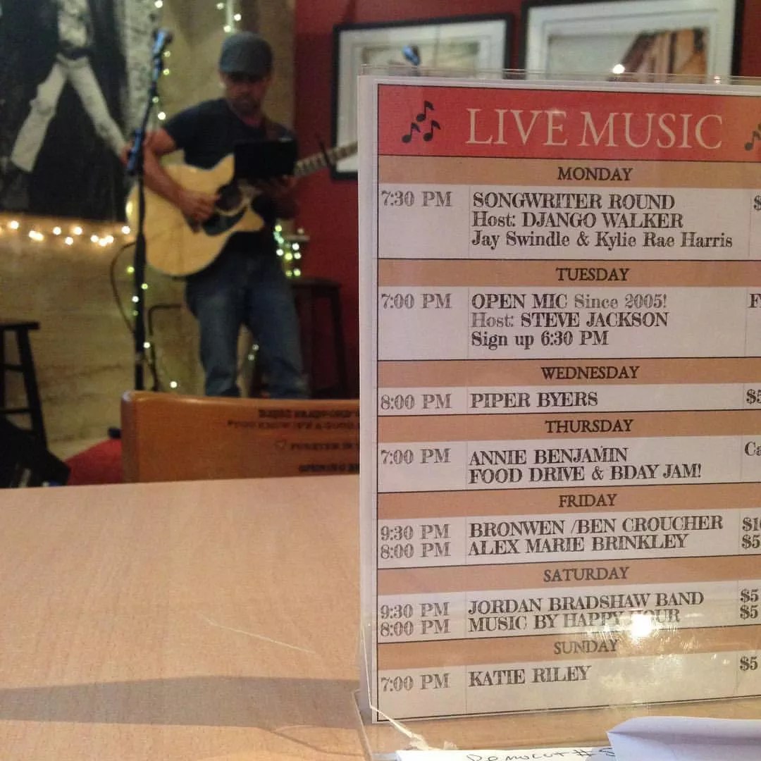 Thirty minutes later, he gives the performers the rundown for the night – who will play and in what order. Then, with a Texas twang, he tells them the rules. Performers get two songs apiece. No backing tracks. If everyone on the list has played before 10 p.m., the list will start over. He ends with a kicker and introduces the first act of the night.