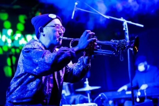 Sitting outside on a chilly November day, Kazunori Tanaka sits with his trumpet case and a shot of liquor having just played a set of jazz with his band, Texas Sloth Loincloth.