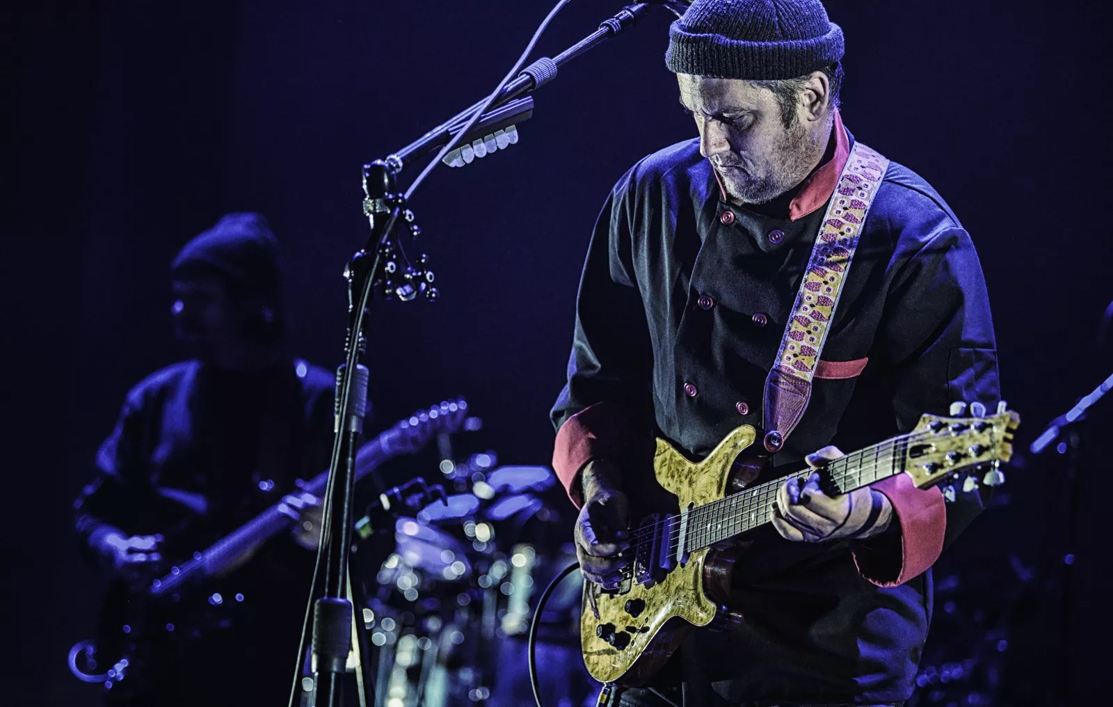 The stage design wasn’t overly showy, until it was: The night began with a simple curtain draped behind the five musicians and a few racks of lights flashing, until “Gold on the Ceiling” roared to life, the curtains fell away and the sort of spendy, splashy display commonly glimpsed in arena settings burst to life, full of rear projections, trippy visuals and splashes of retina-searing light.