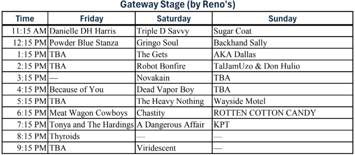 Booking for the “Gateway Stage,” located at 200 N Crowdus St., was a collaborative effort with the management behind Reno’s Chop Shop Saloon, who recommended a few acts that previously played at their stage, notably the rowdy three-piece, Thyroids.