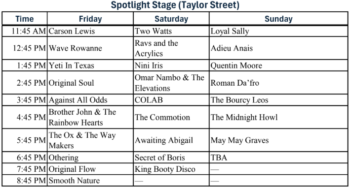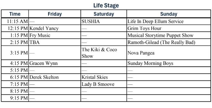 Lastly, DECAF’s new fourth stage is dubbed the “Life Stage,” and features some limited acts, with empty spaces to be filled with Booker T. Washington students and buskers from the Texas Music Office’s busking initiative. Screenshot from Deepellumfair.com