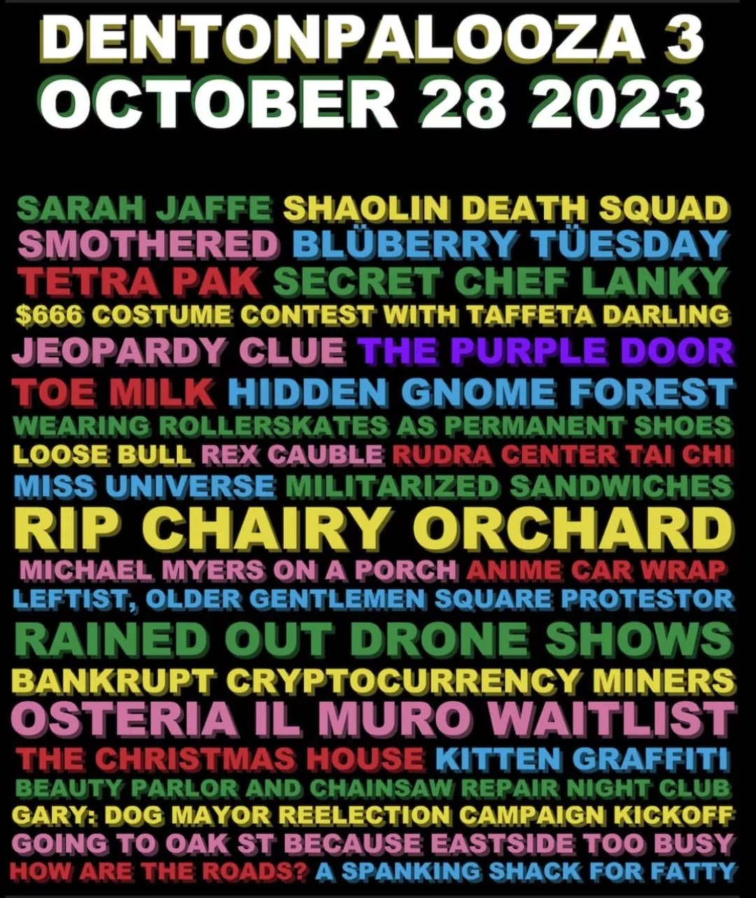 Musical acts include headliner Sarah Jaffe, Shaolin Death Squad, Smothered, Blüberry Tuesday and more. Vendors include specialty cookie maker and decorator Mandy Metts, as well as Barnhart’s Barbershop. And in true Dentonpalooza style, a variety of unique guests will take the stage, including Secret Chef star and culinary director of Ten: One Artisan Cheese Anthony Langston, for a segment called “Do You Know Your Cheese?” There will also be a protesting masterclass with “Fred Flintstone,” known by locals as the “leftist, older gentleman Square protestor,” according to the event’s poster.