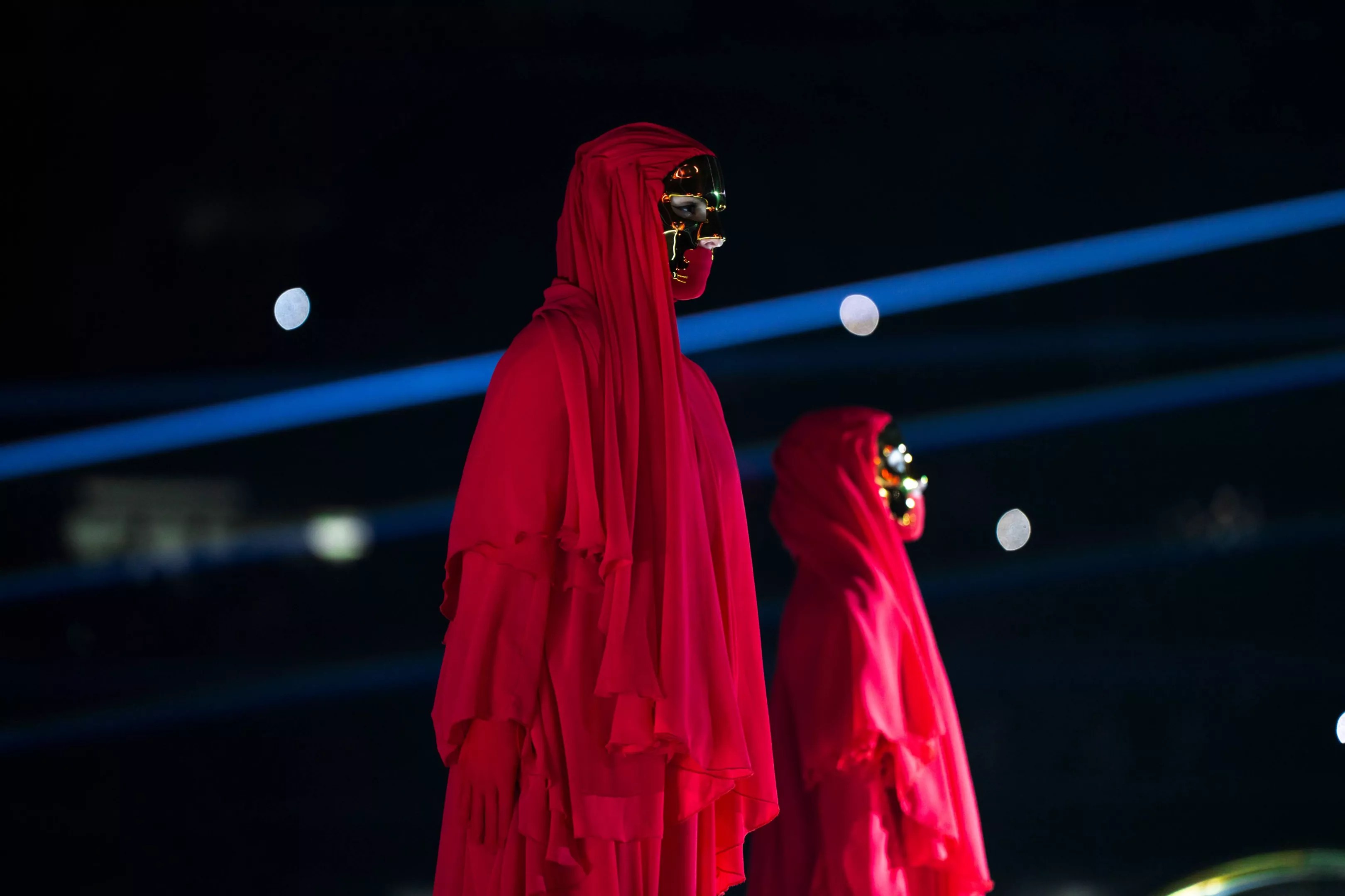 The Weeknd’s dancers dressed in red robes.