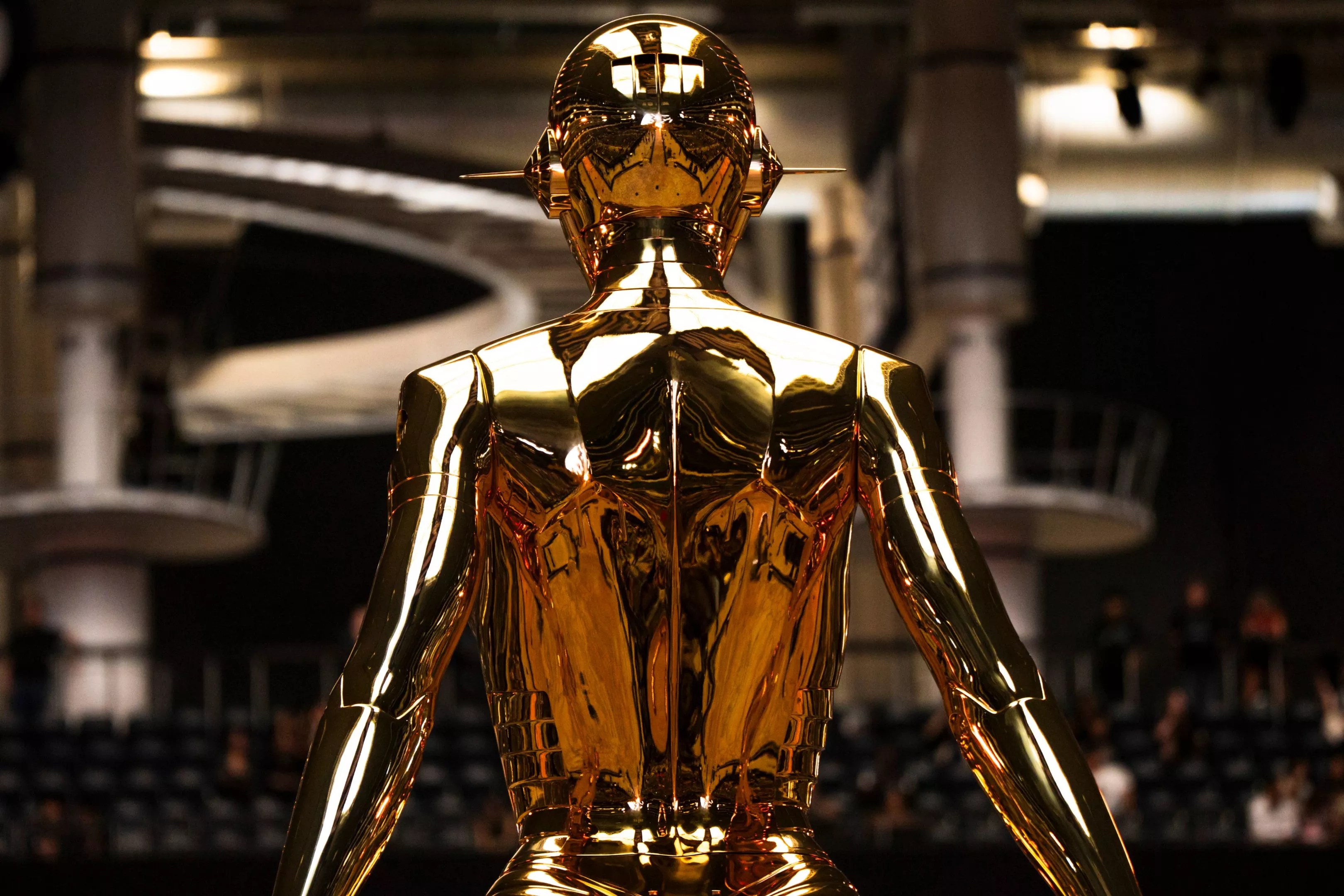 At around 9 p.m., the lights went down as a couple of dozen dancers adorned in red drapes flanked the front of the stage. We first heard his voice, The Weeknd’s unmistakable falsetto singing his part of “The Abyss,” a new song from Hurry Up Tomorrow featuring Lana Del Rey. He emerged from behind his troupe of dancers wearing a sparkly black robe and a metal mask with glowing eyes, which he performed in for the first few songs. In the center of the stadium, an enormous metal colossus with similarly glowing eyes fixed its gaze on him and rotated around the stadium following in whatever direction he was performing.